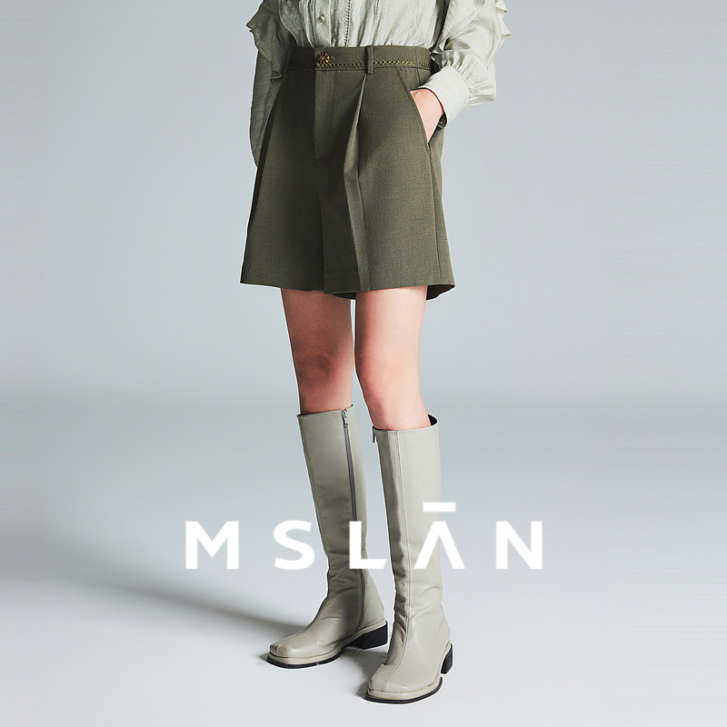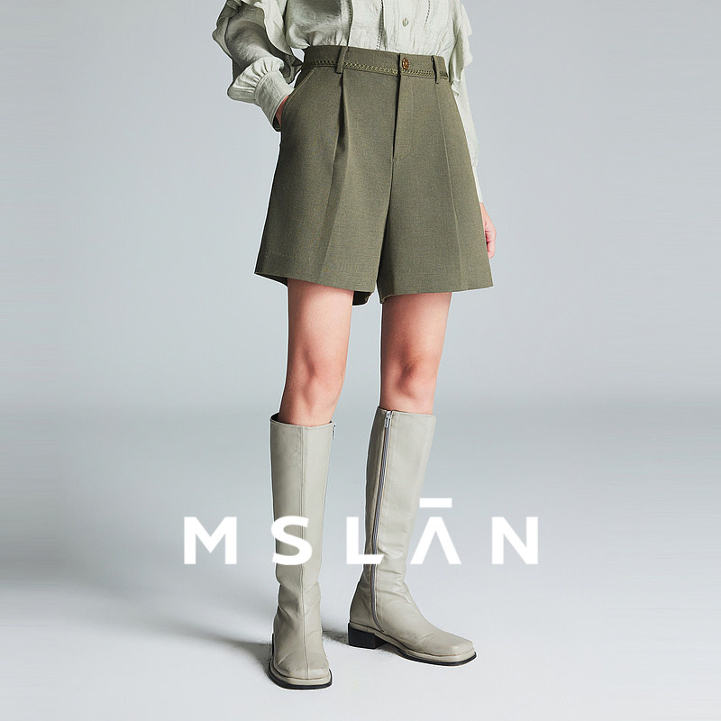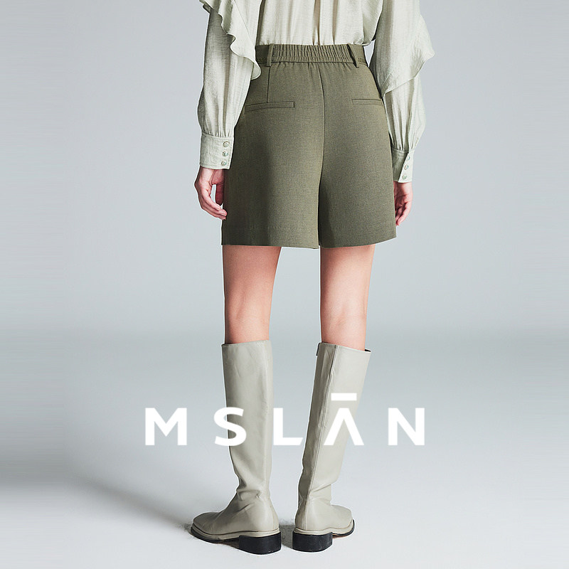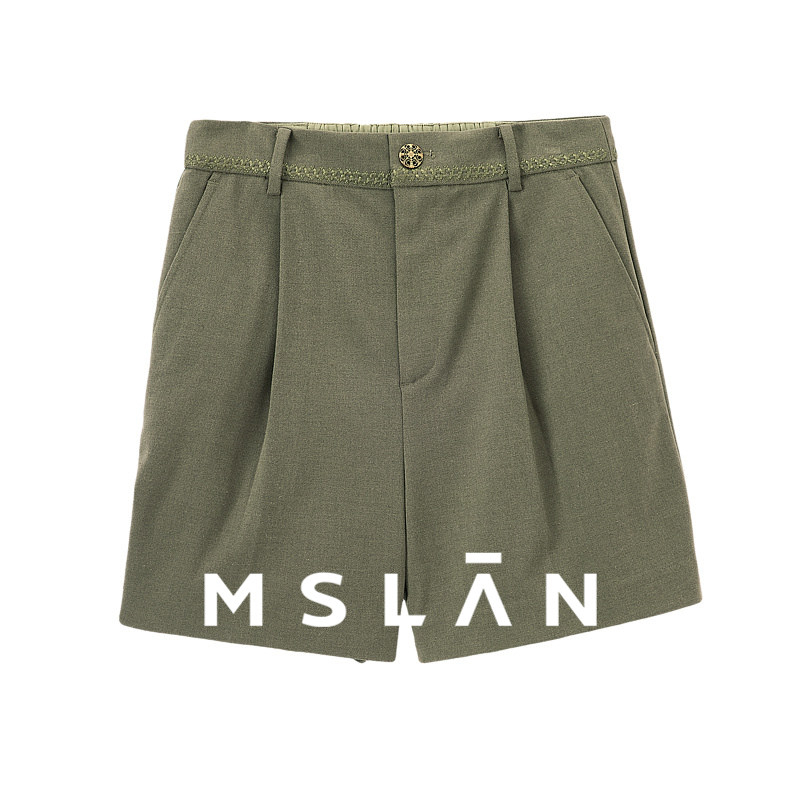 不易皱|MSLAN春季民族风松紧腰弹力卡其绿西装短裤MFDK039