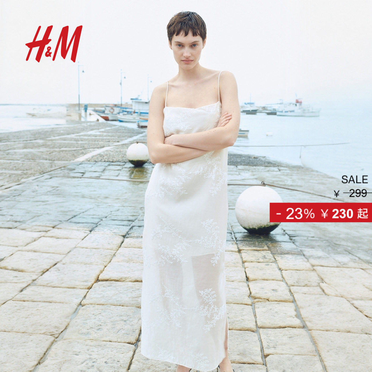 HM女装无领连衣裙2025冬季新款刺绣吊带方领修身气质长裙1289336