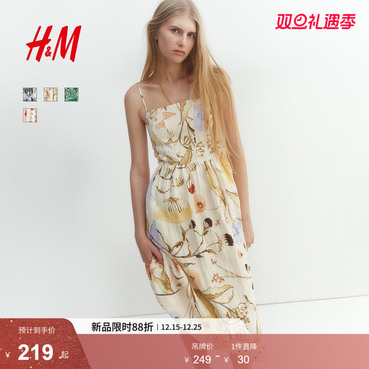 HM女装连衣裙冬季度假风亚麻混纺方领植物印花吊带长裙1217048