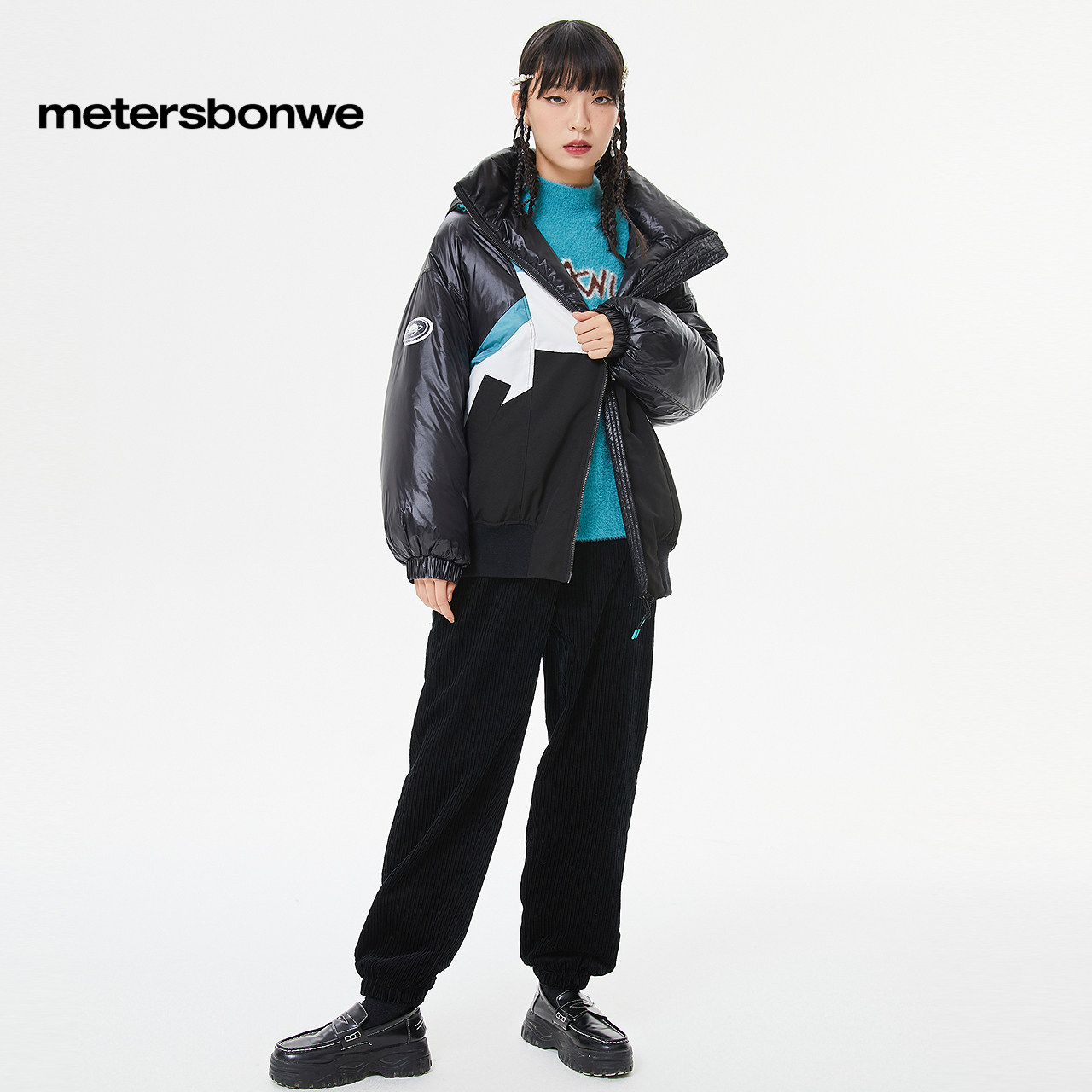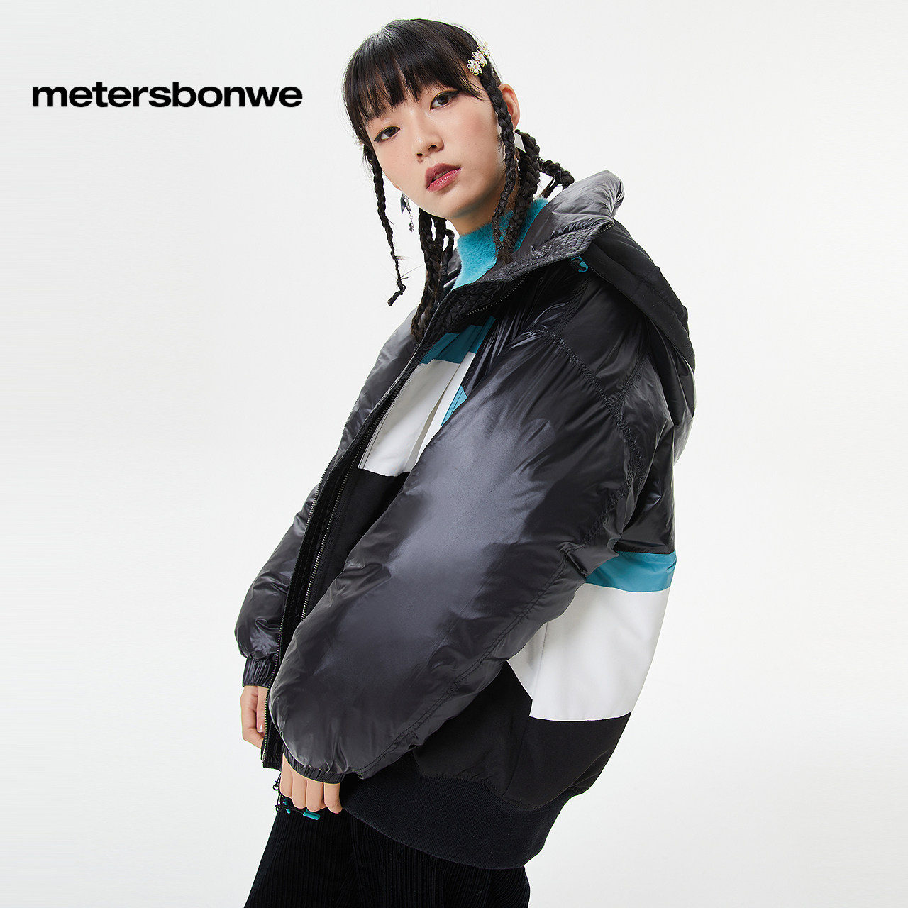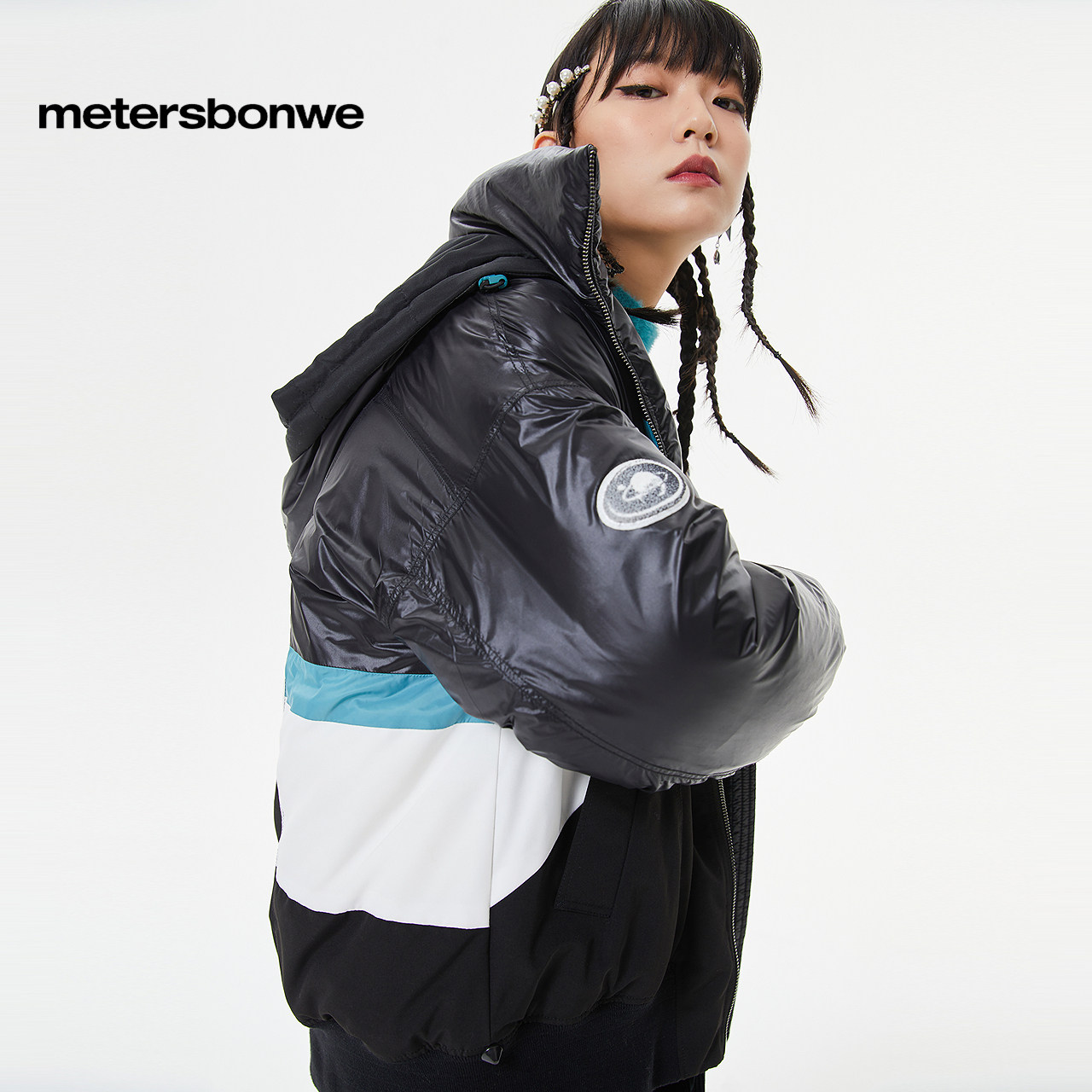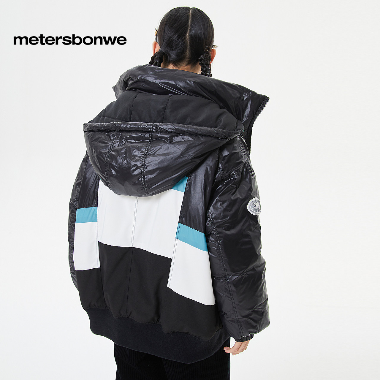 美特斯邦威羽绒服女士时尚拼色中长款潮牌运动连帽宽松外套
