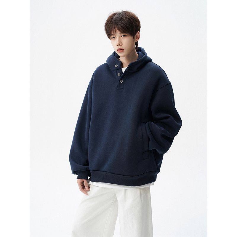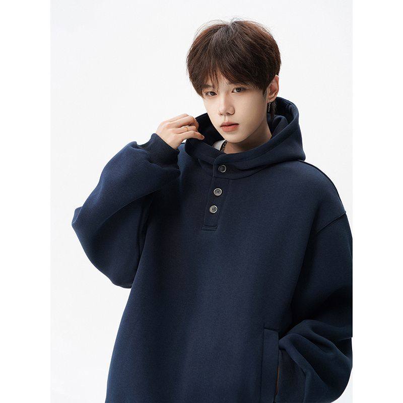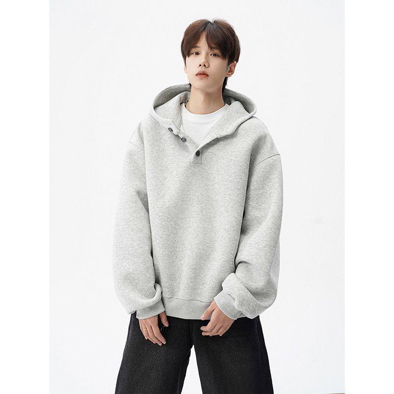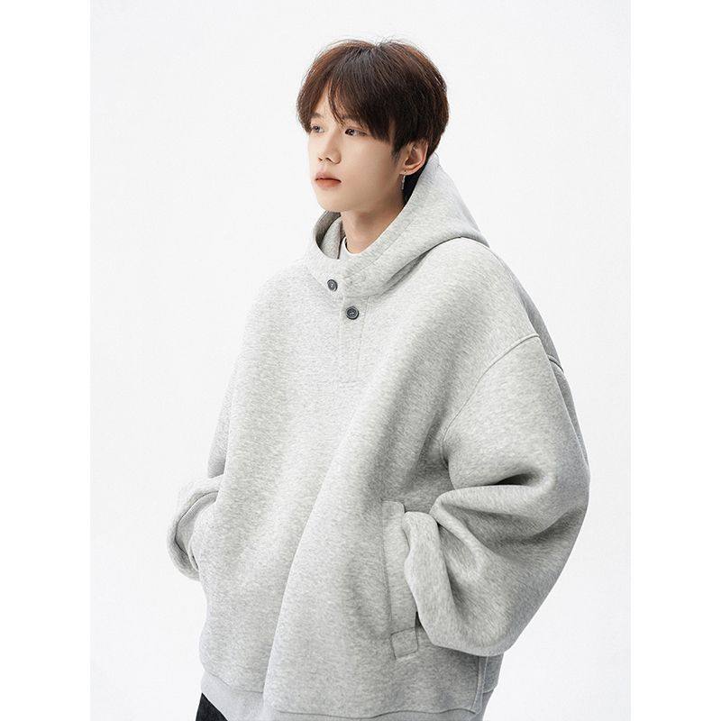 美式纽扣连帽加绒加厚卫衣男秋季潮牌外套高街宽松休闲情侣衫灰色