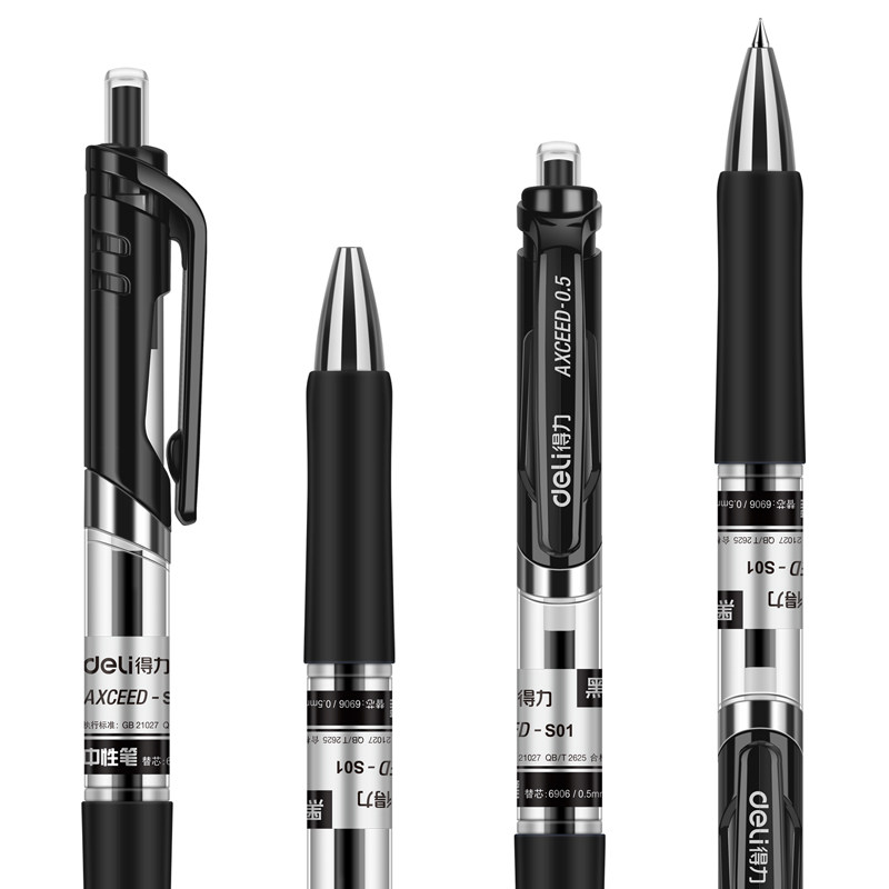 得力按动式中性笔S01子弹头按动笔学生用笔考试专用黑色笔芯大容量红笔圆珠笔办公签字笔红色蓝色水笔文具