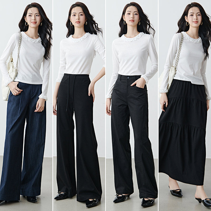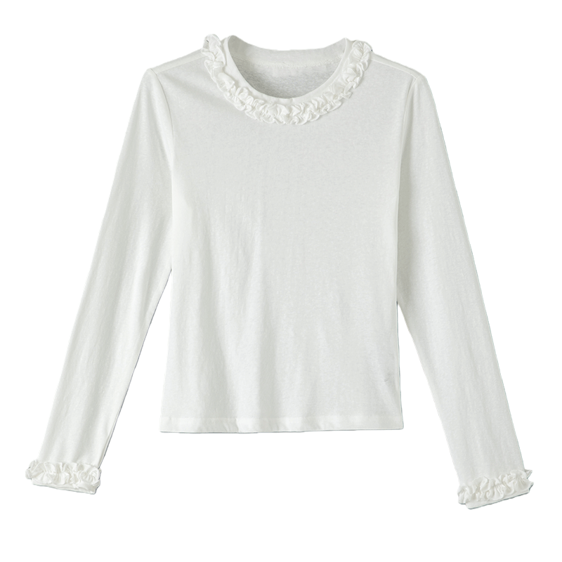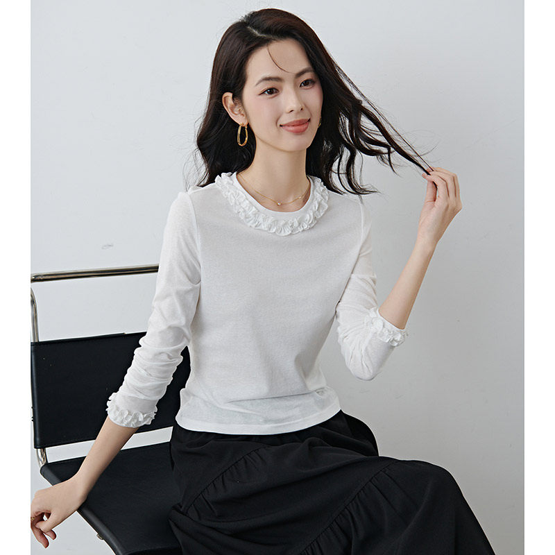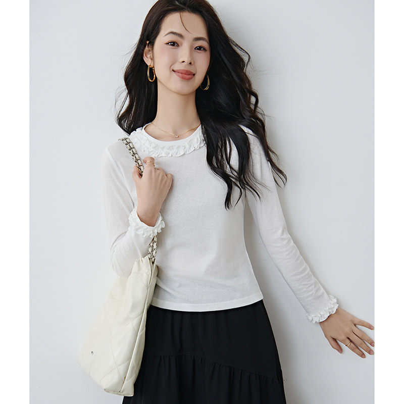 晚白2026年春新款木耳花边圆领雪花棉上衣亲肤舒适百搭T恤衫女
