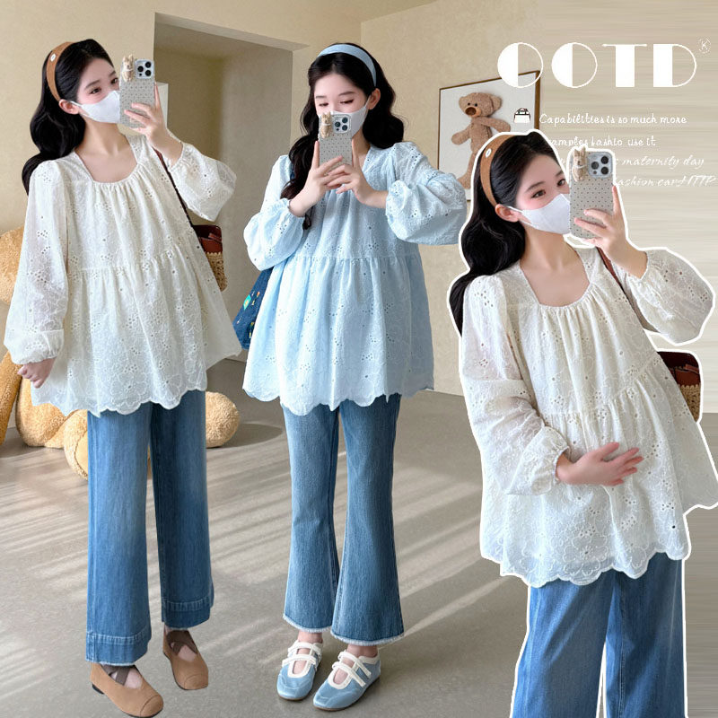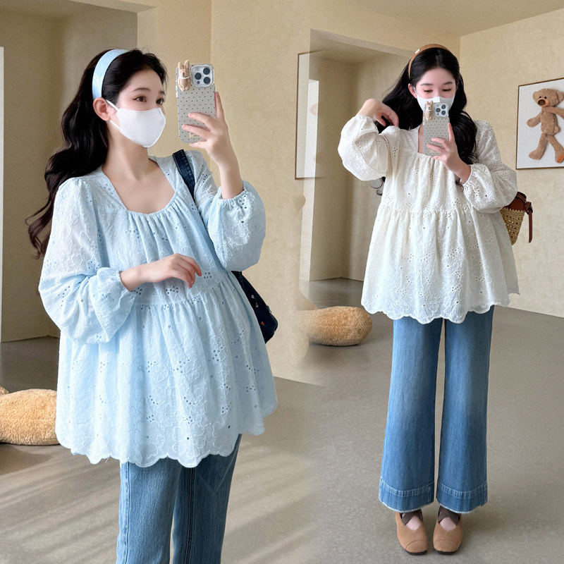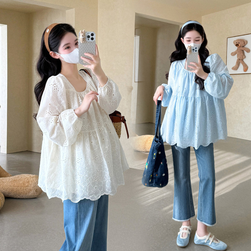 婧麒宽松孕妇装春装上衣2026新款春夏女孕妇衬衫镂空花纹孕妇衬衣