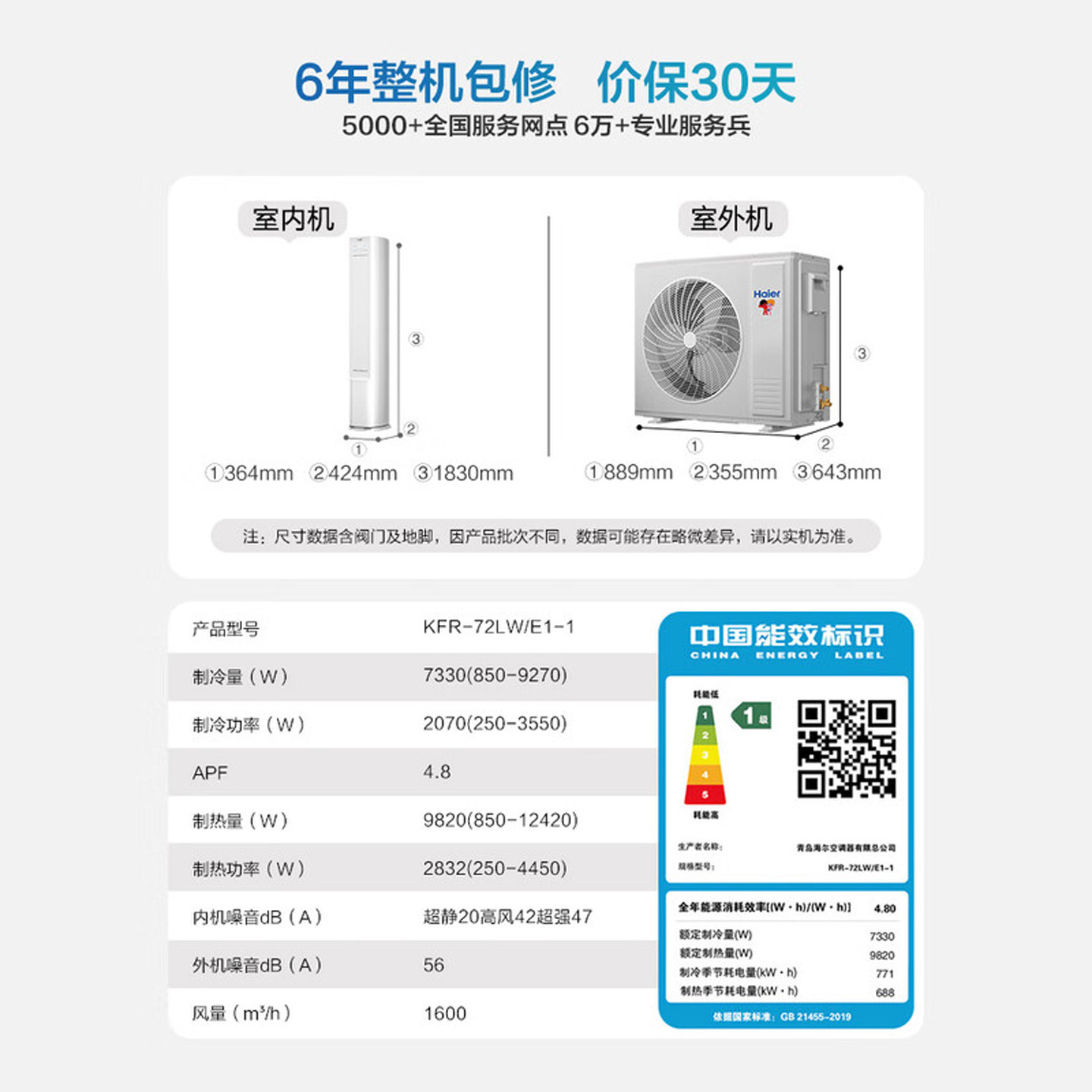 海尔空调3匹立式柜机72E1家用一级能效变频净省电Plus官方旗舰店