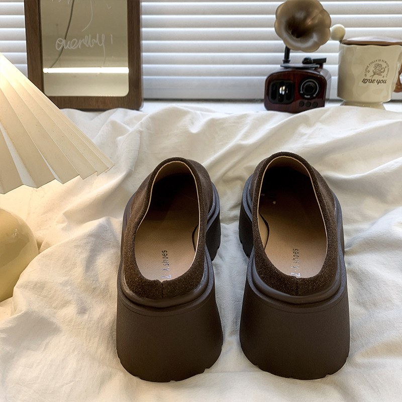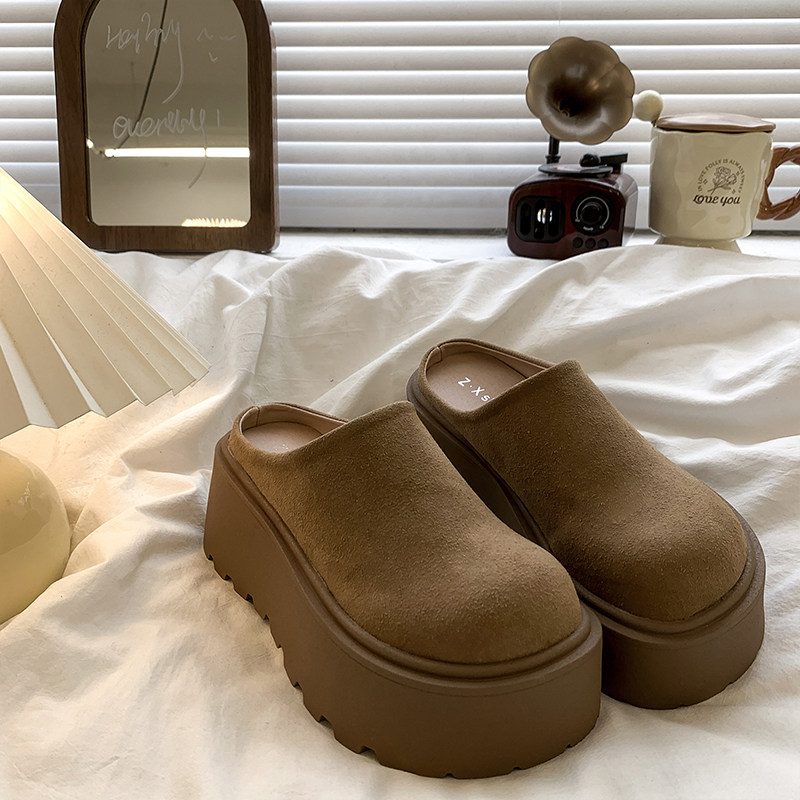 内增高6cm~厚底真皮勃肯鞋女2025秋冬新款真皮包头半拖鞋女外穿