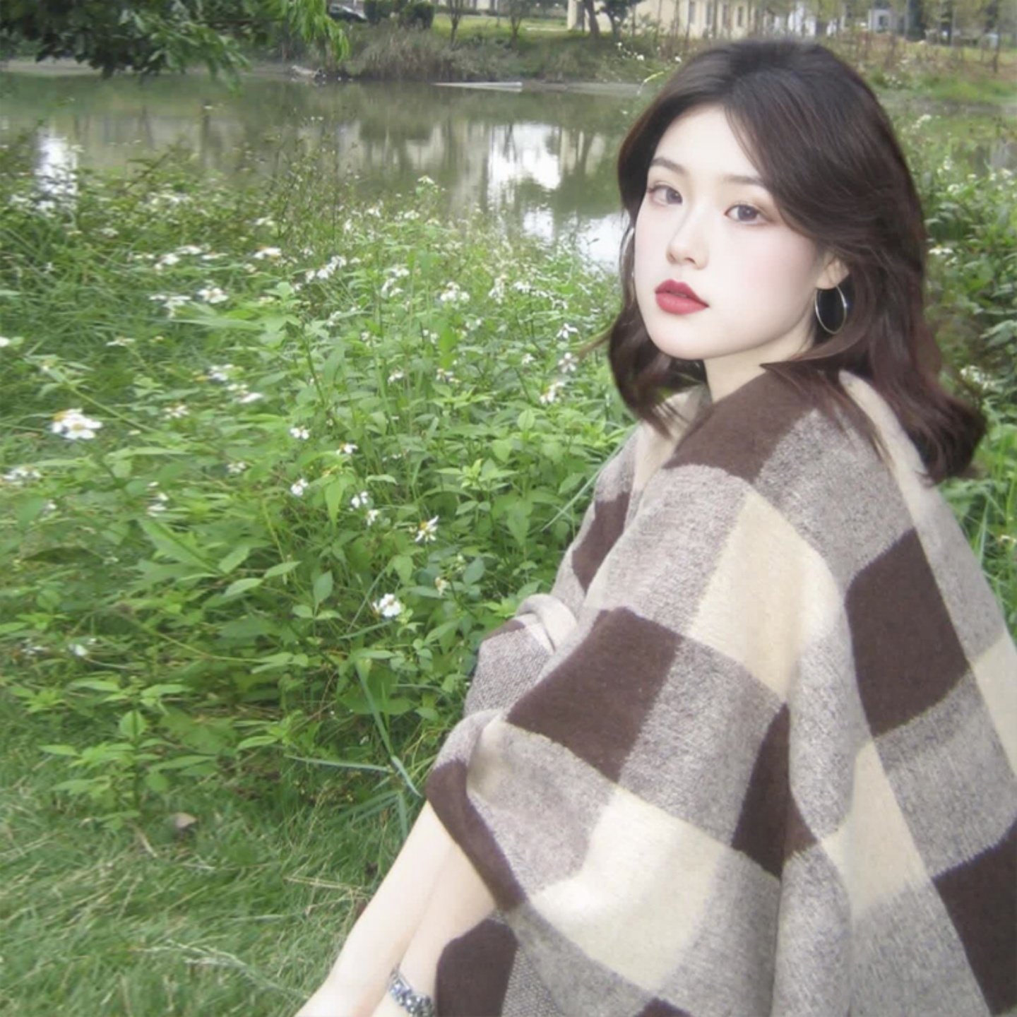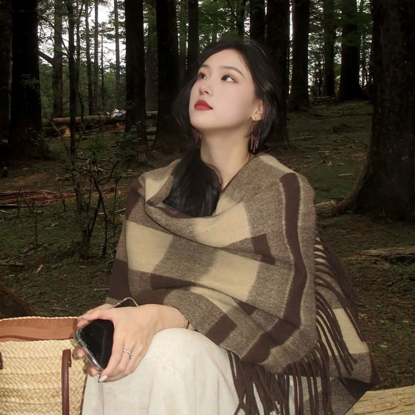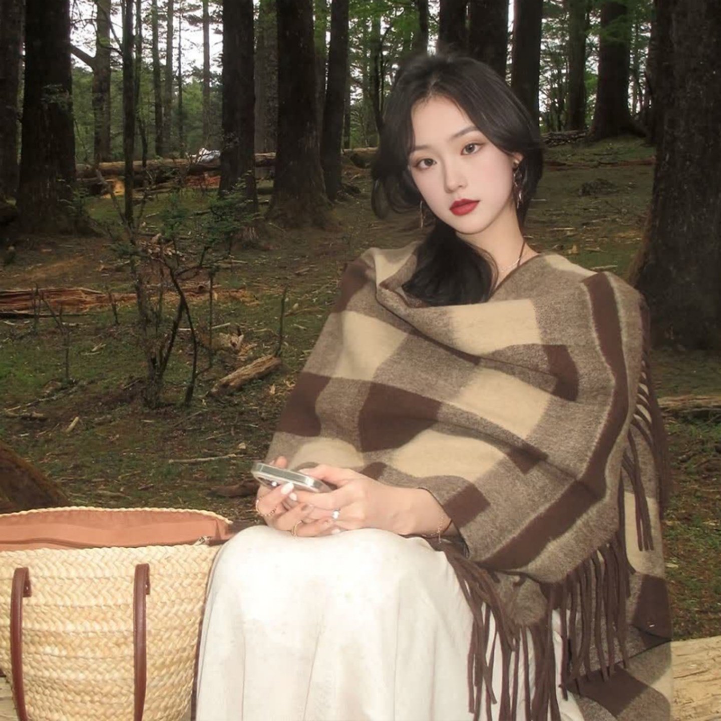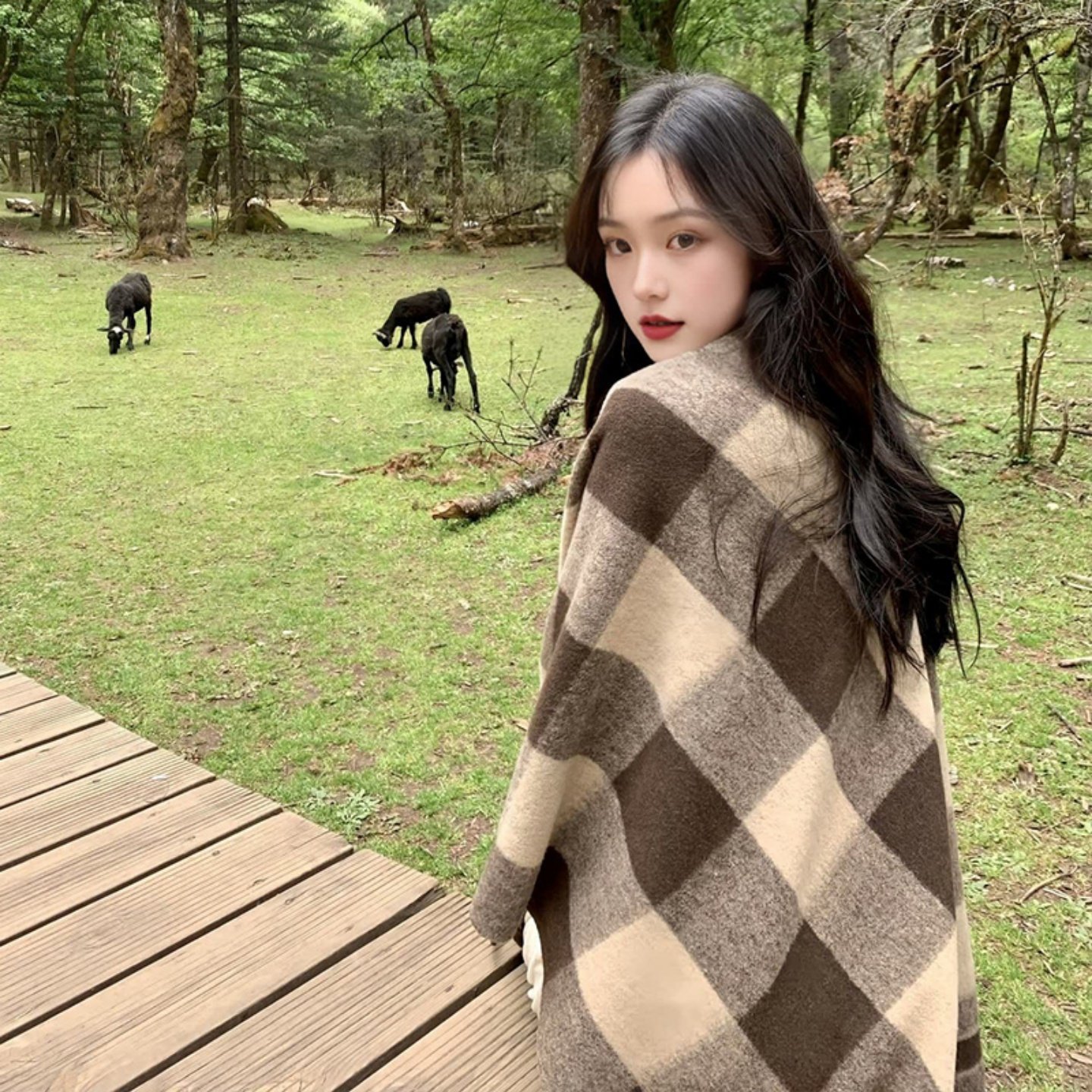 2025新款披肩外搭女旅游穿搭秋内蒙古草原围巾格子斗篷大披风流苏