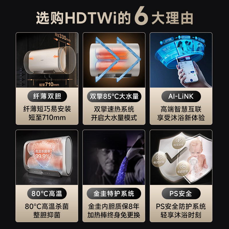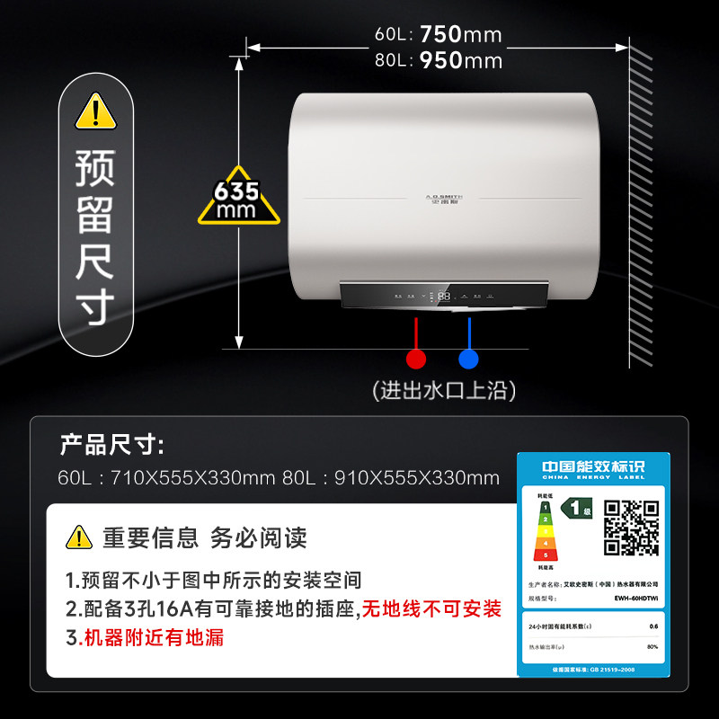 国补AO史密斯电热水器60/80升MS纤薄双胆智能超薄节能卫生间家用