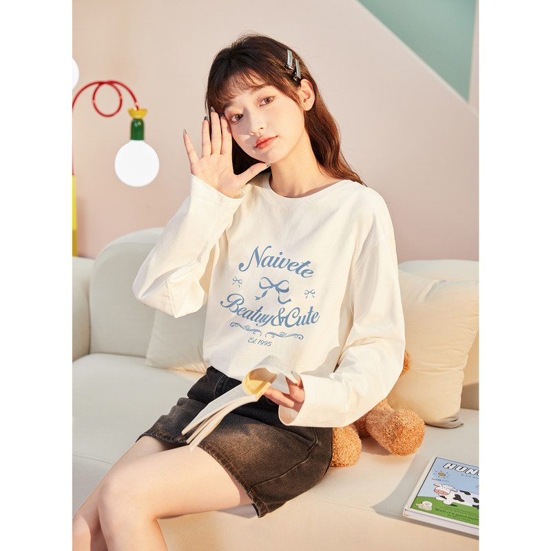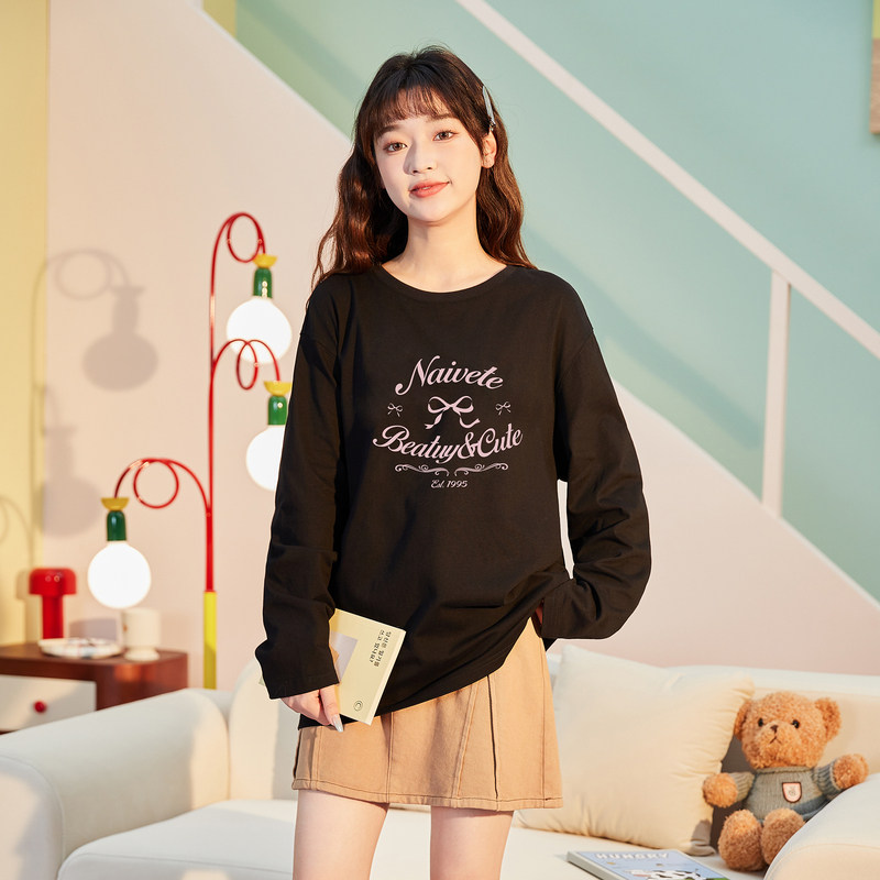 唐狮春秋装新款女长袖T恤宽松休闲圆领日常小清新上衣女甜美风TE