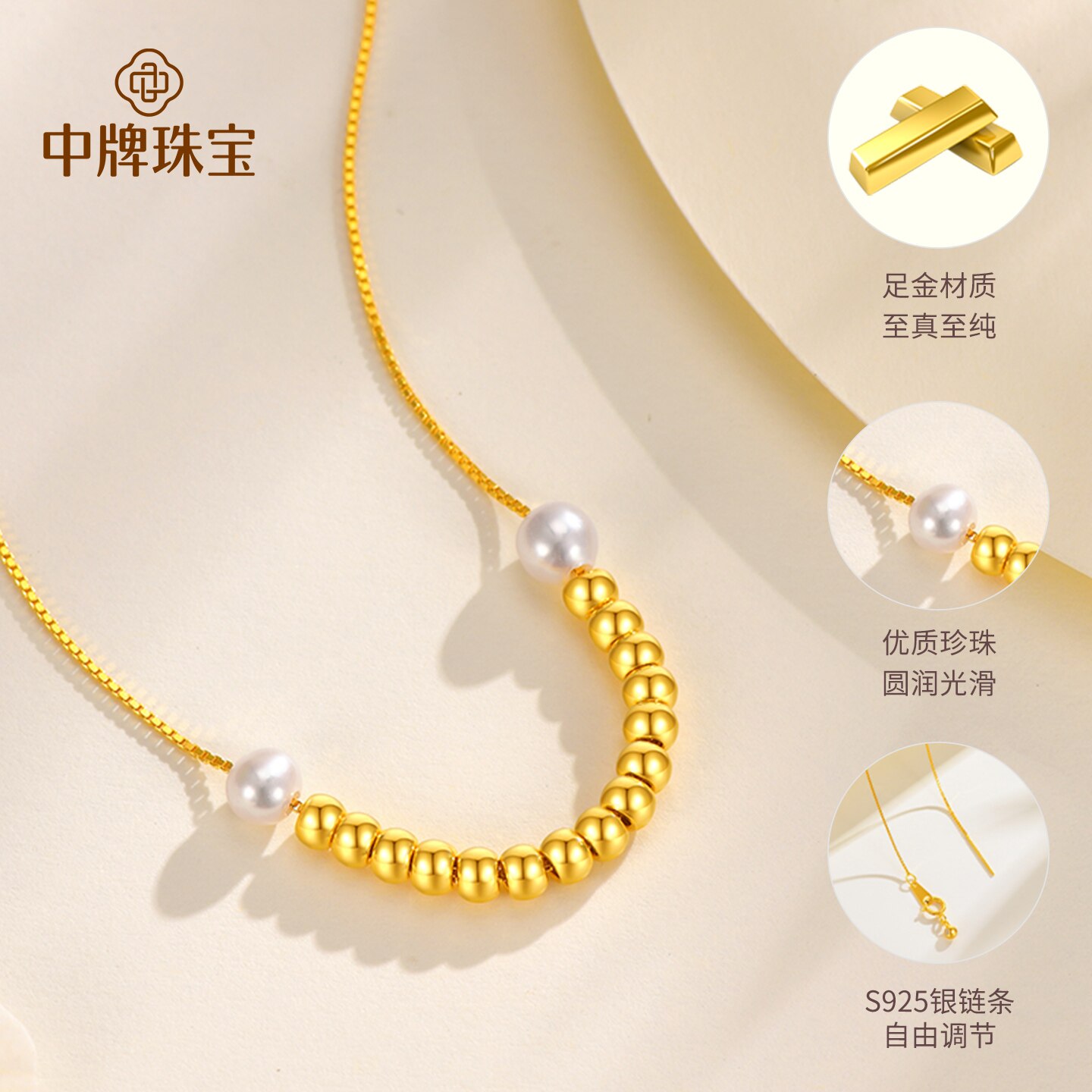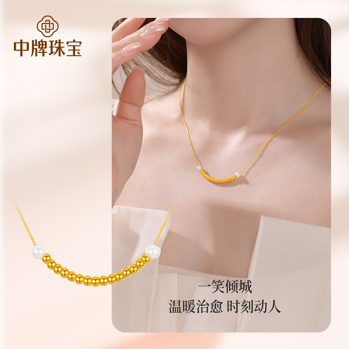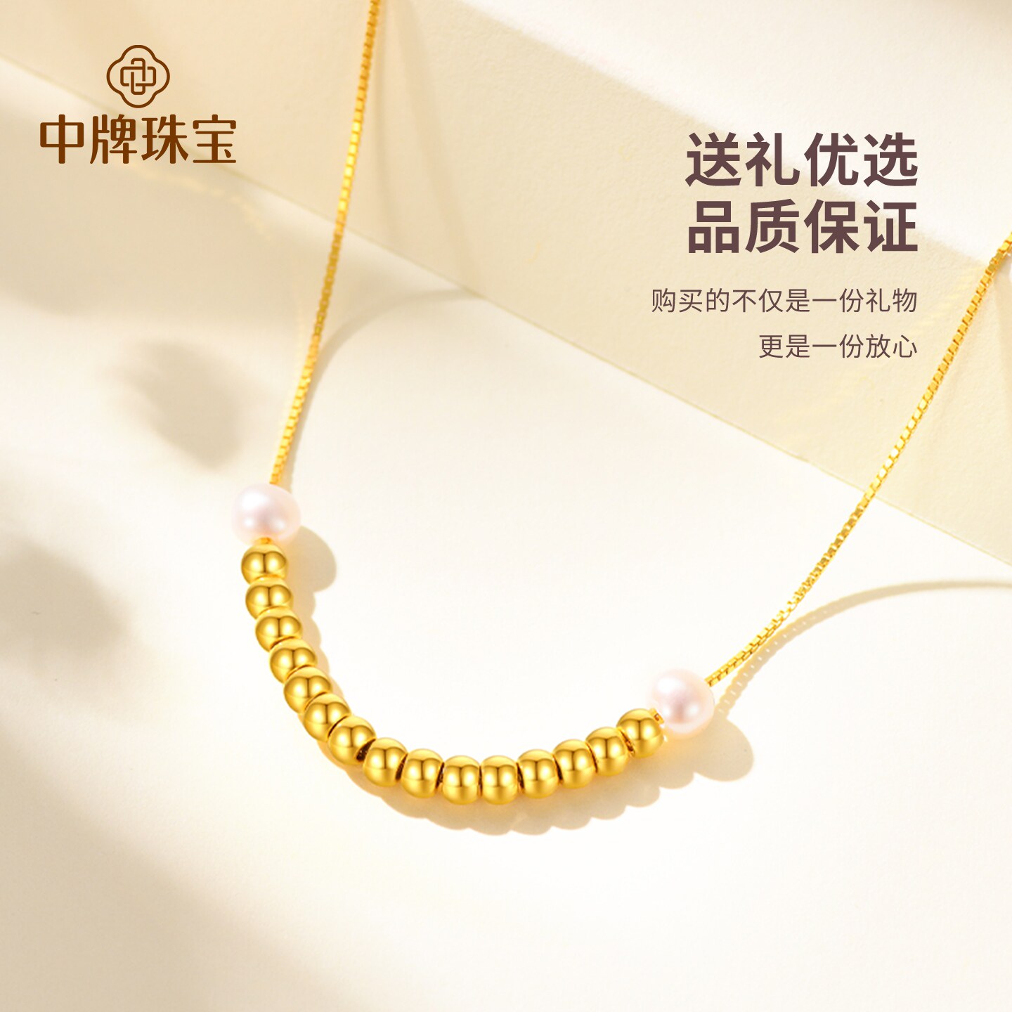 中牌珠宝黄金项链一笑倾城足金套链微笑转运珠珍珠金锁骨链送女友