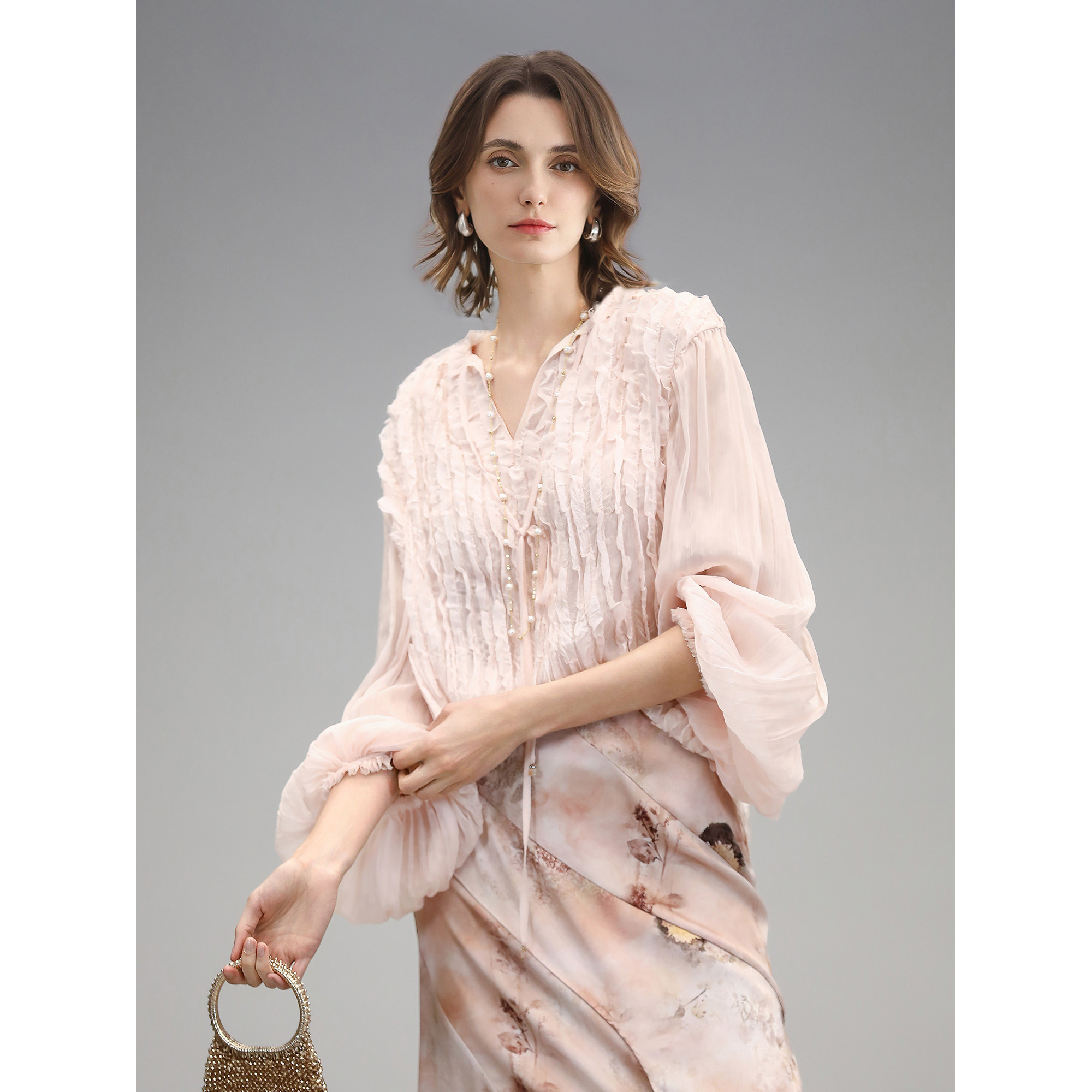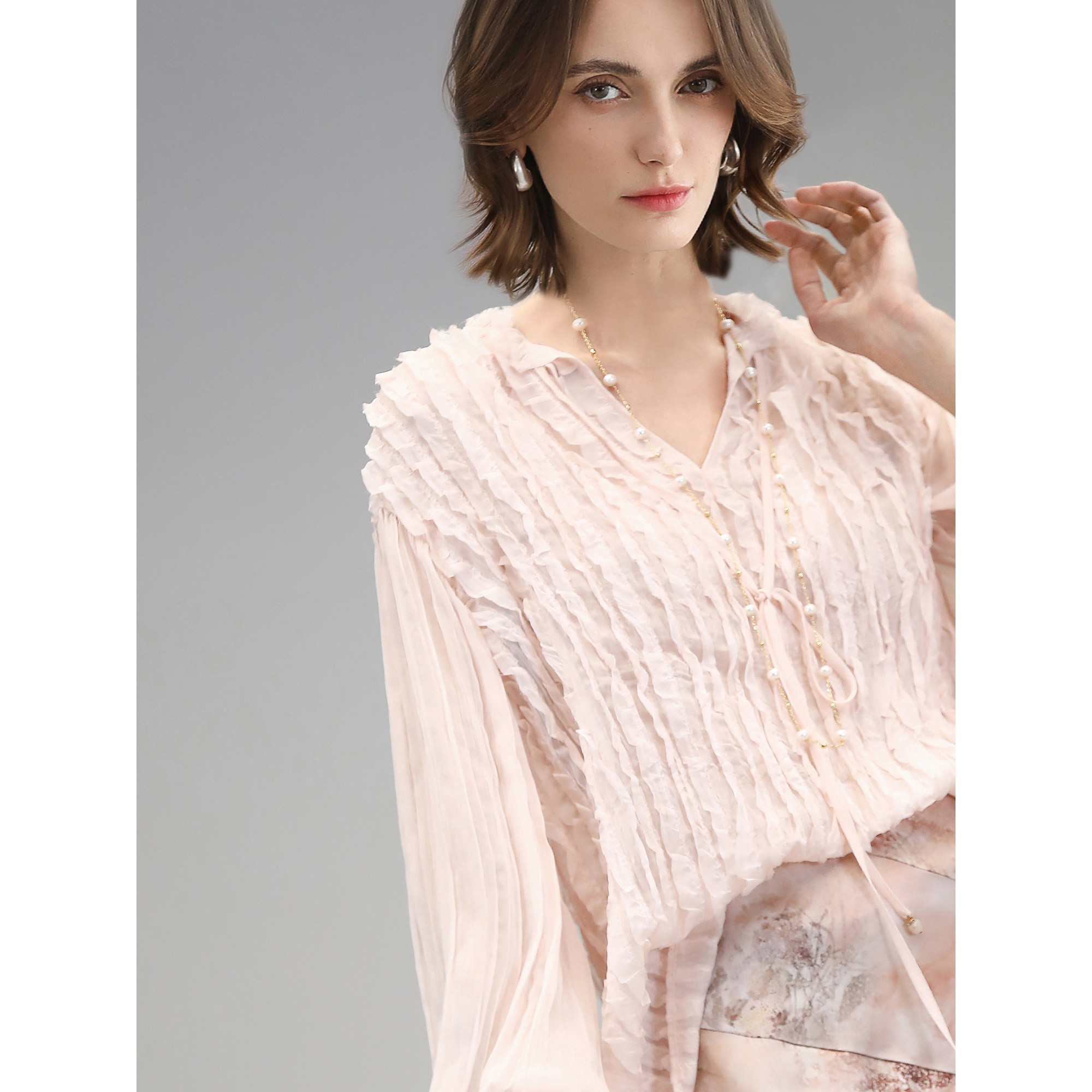 COCOBELLA名媛风木耳边绗缝压褶飘带衬衫女优雅立领雪纺衫SR3006