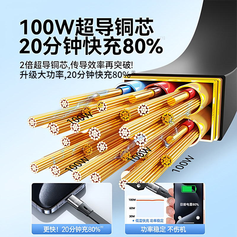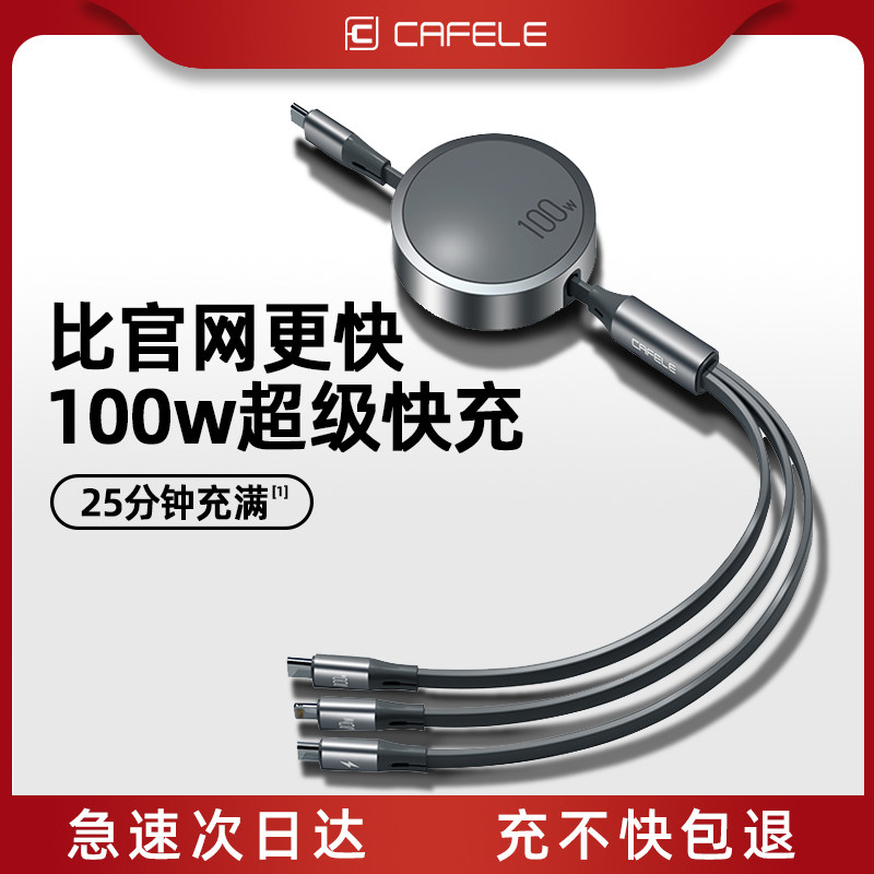 三合一数据线100W超级快充一拖三Typec手机车载充电线器头宝伸缩多功能PD适用于苹果安卓6A编织usb闪充iPad17