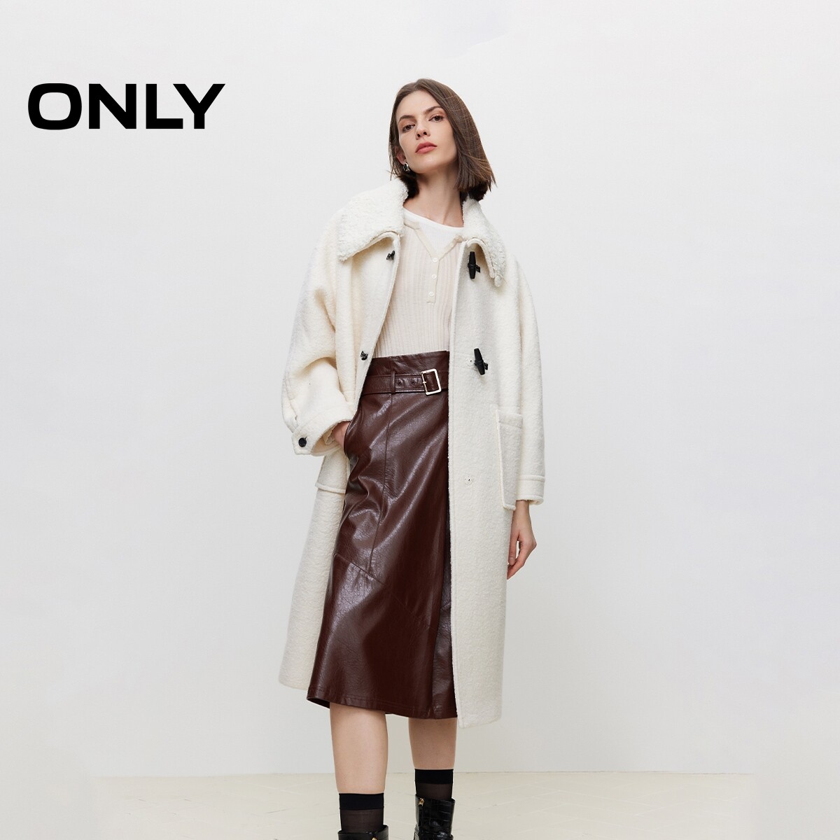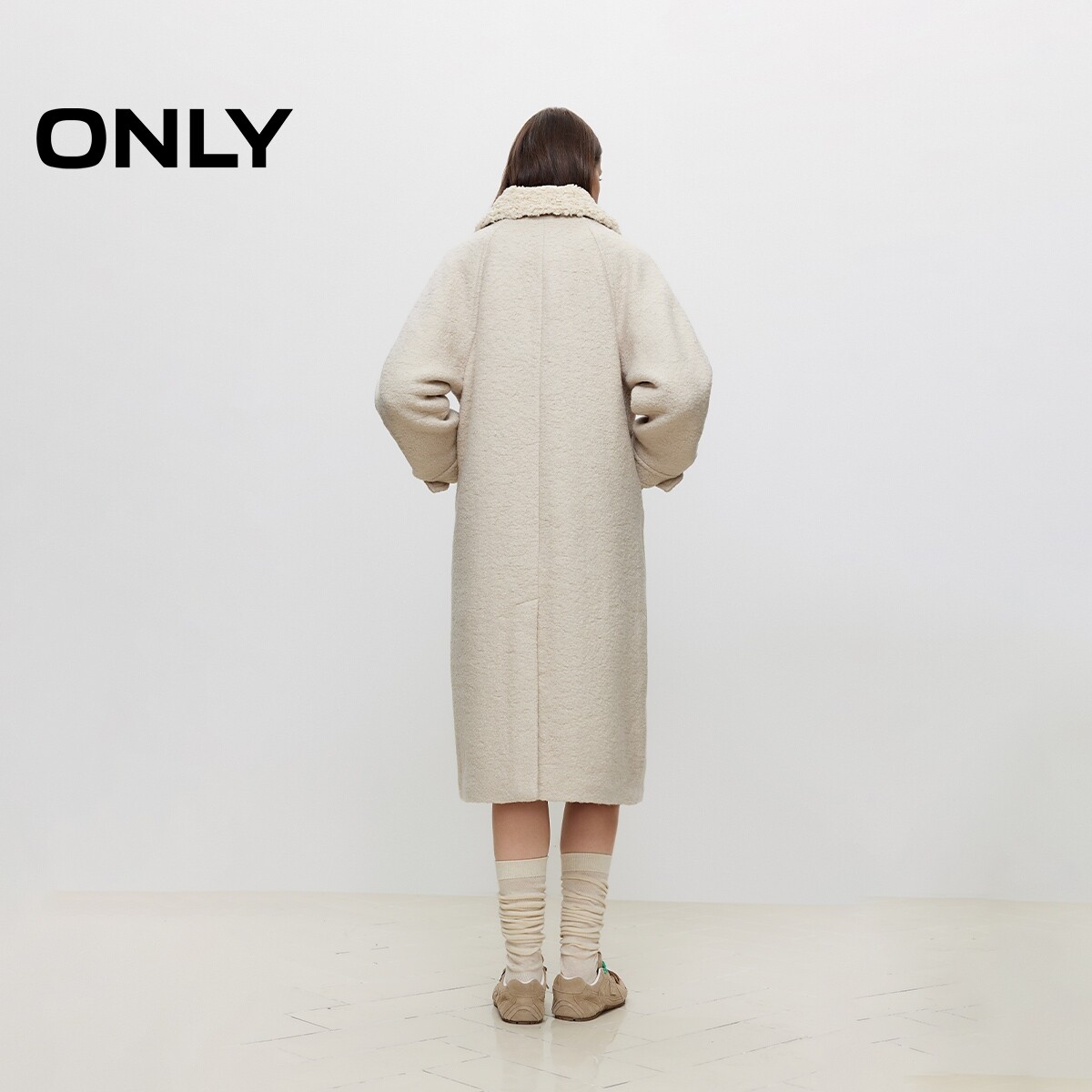 ONLY气质翻领泰迪毛牛角扣长款羊毛纯色毛呢大衣女|12336U011