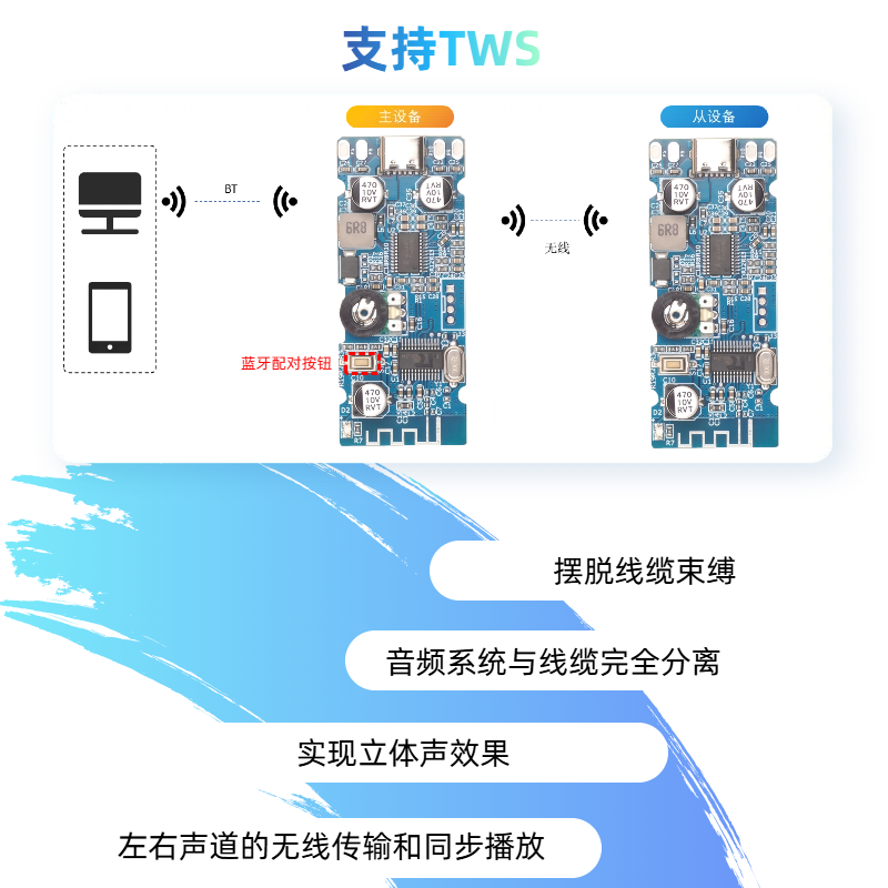 BDM0 2.0立体声2x6W蓝牙功放板BT5.0放大模块供电5V带音量调节TWS