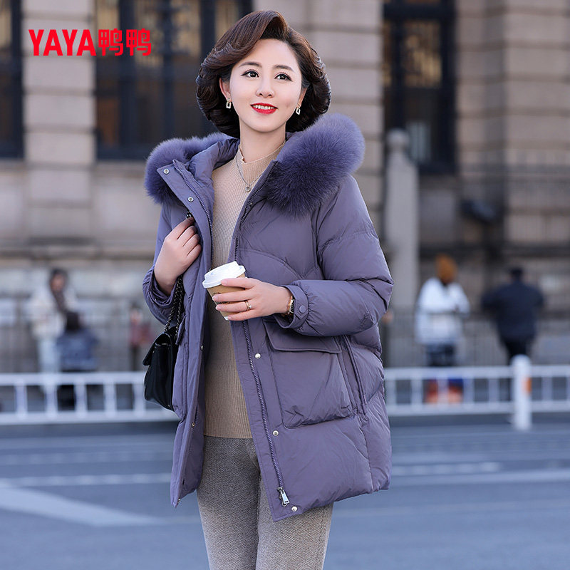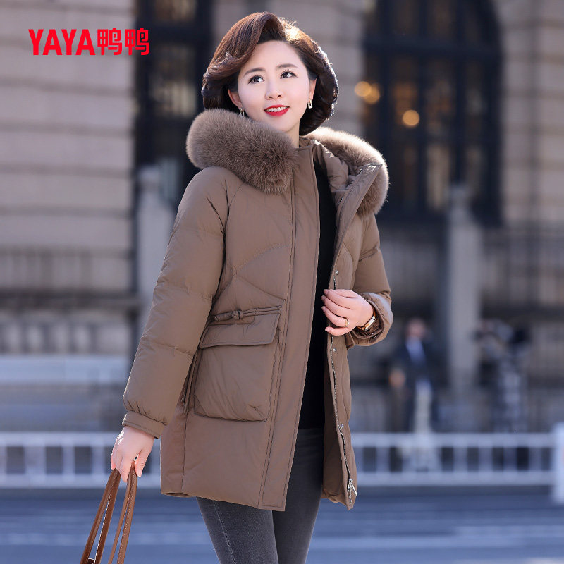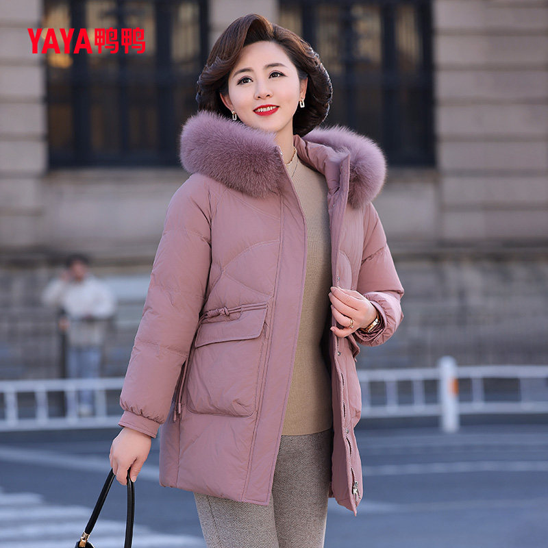 鸭鸭羽绒服中老年女款2025年妈妈装中长款狐狸毛领宽松保暖外套J