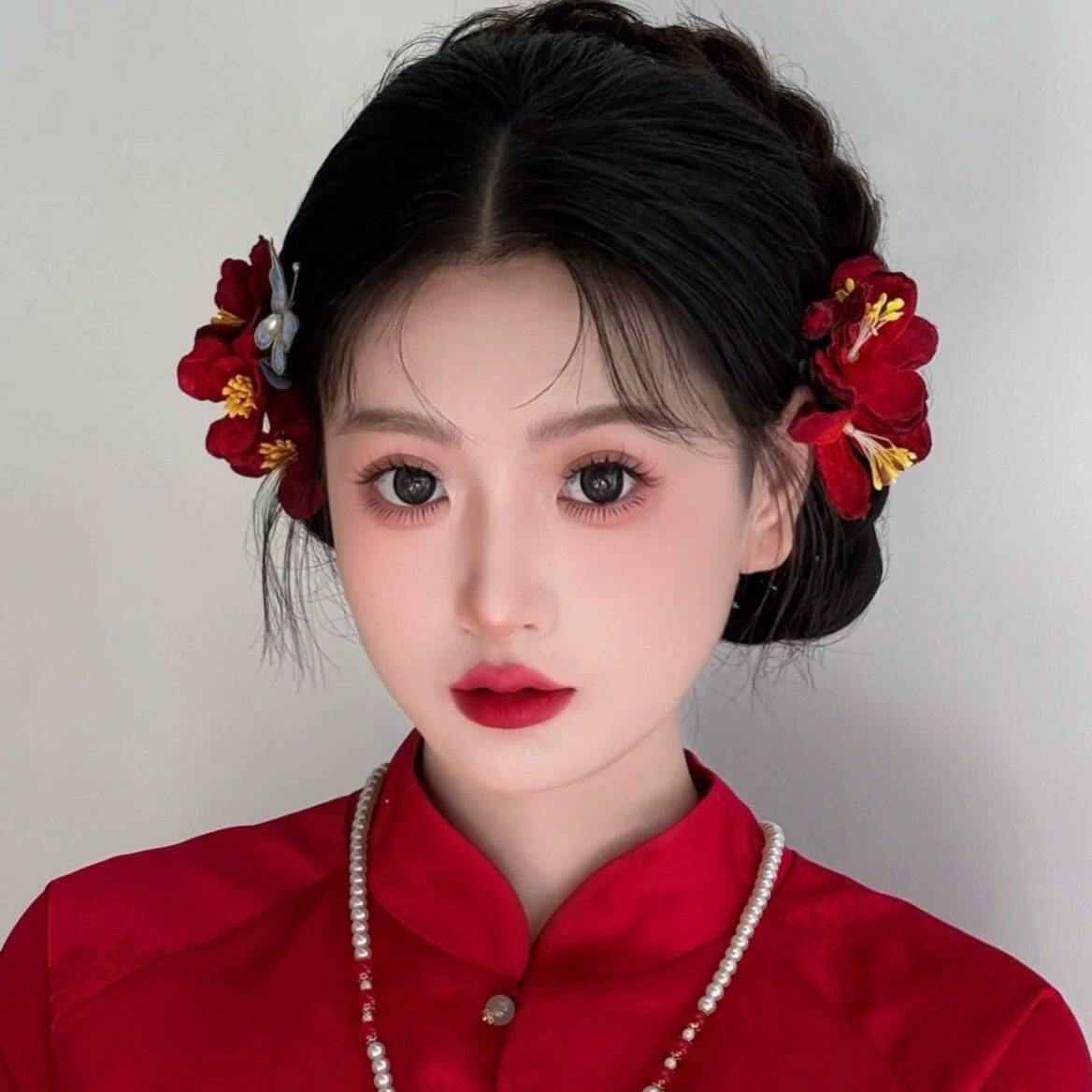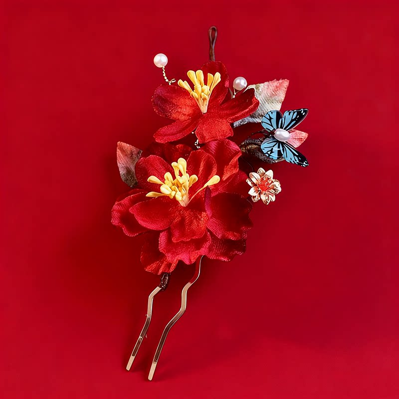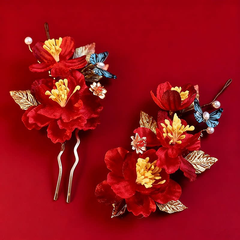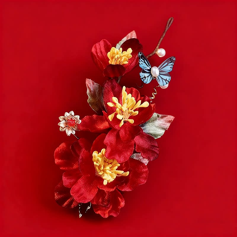 新娘秋冬红山茶新中式饰品秀禾头饰旗袍古风敬酒服发簪山茶花蝴蝶