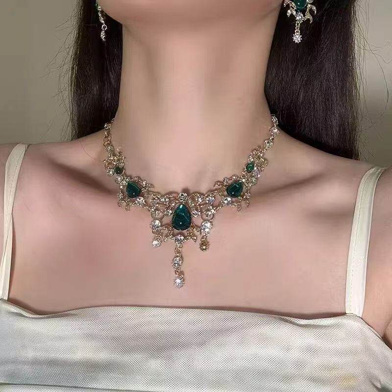 复古宫廷绿色气质重工锆石水滴项链套装精致锁骨宴会耳钉配饰耳环