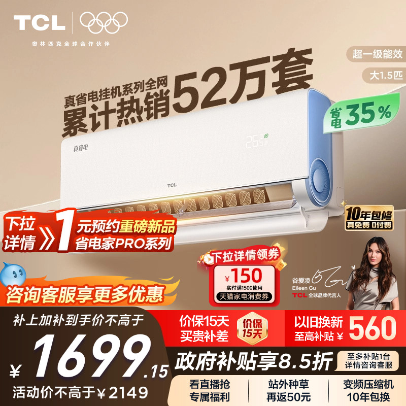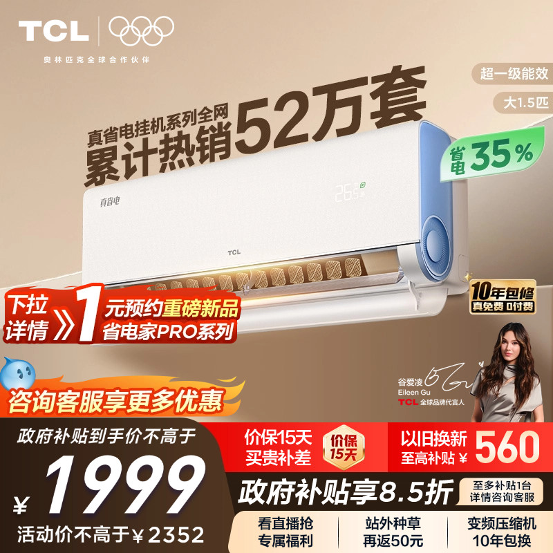 TCL 大1.5匹小蓝翼真省电Pro空调挂机超一级能效省电40%变频空调