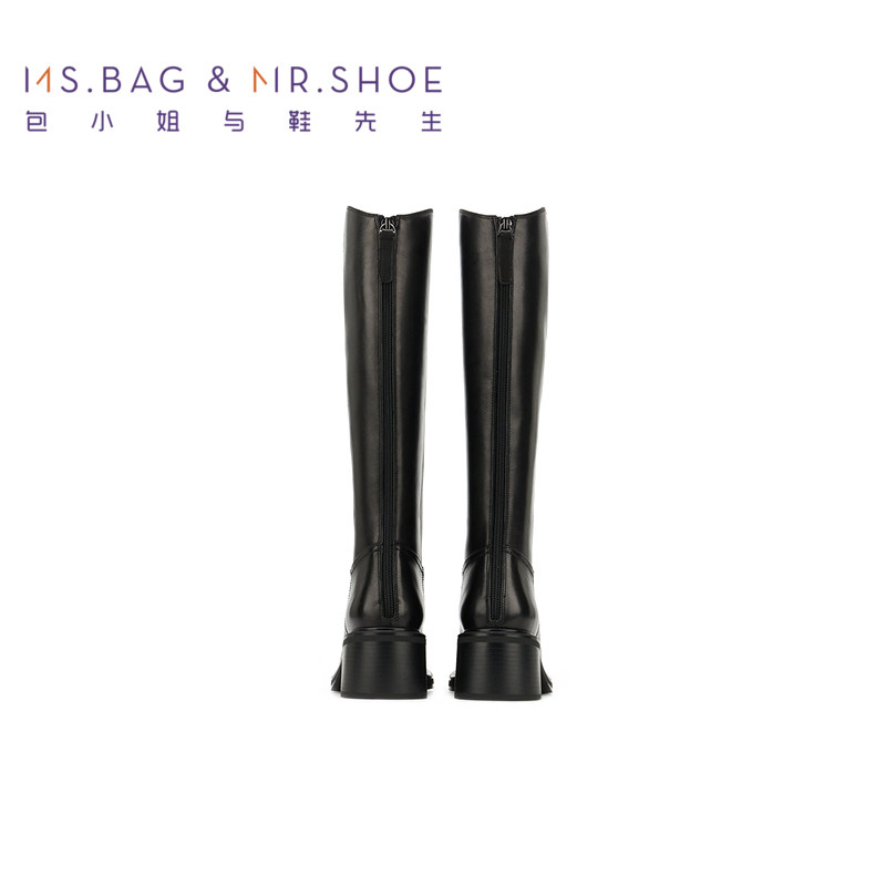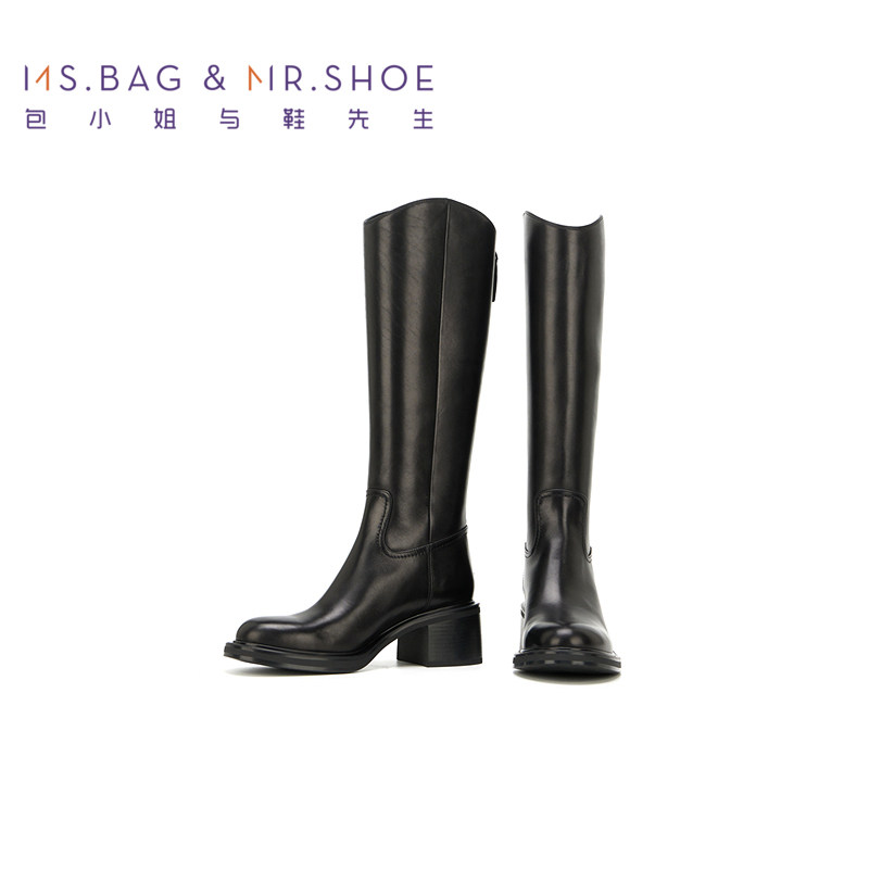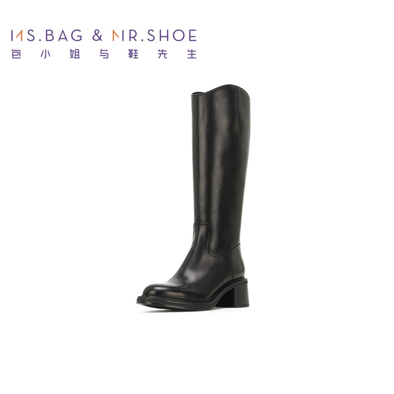 包小姐与鞋先生秋冬黑色牛皮粗跟高筒骑士靴女244262