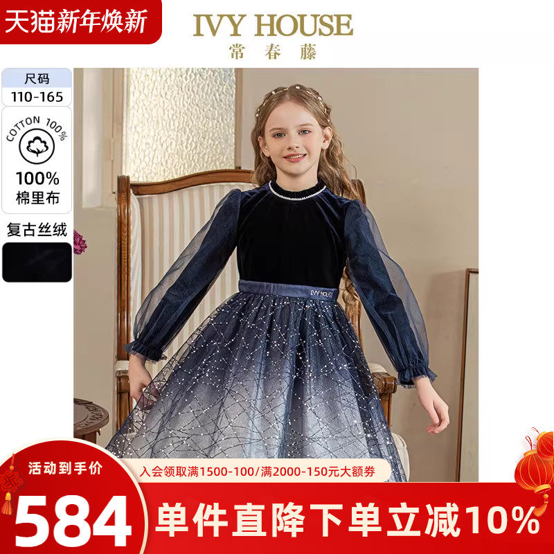 IVY HOUSE常春藤童装女童秋季新款 渐变星空高端礼服连衣裙复古绒