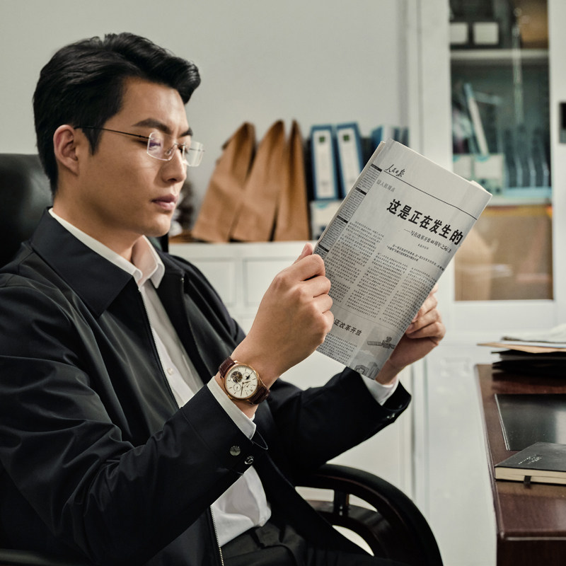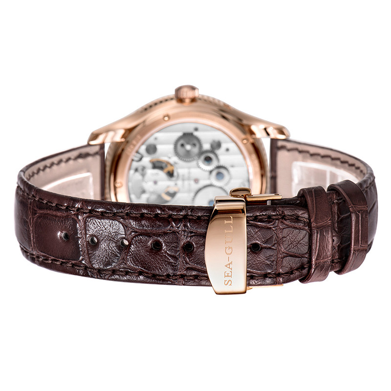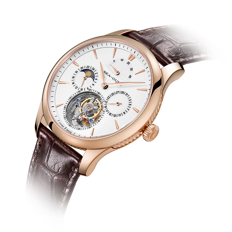 海鸥手表多功能鳄鱼皮带陀飞轮金壳男表机械表男518.937传承