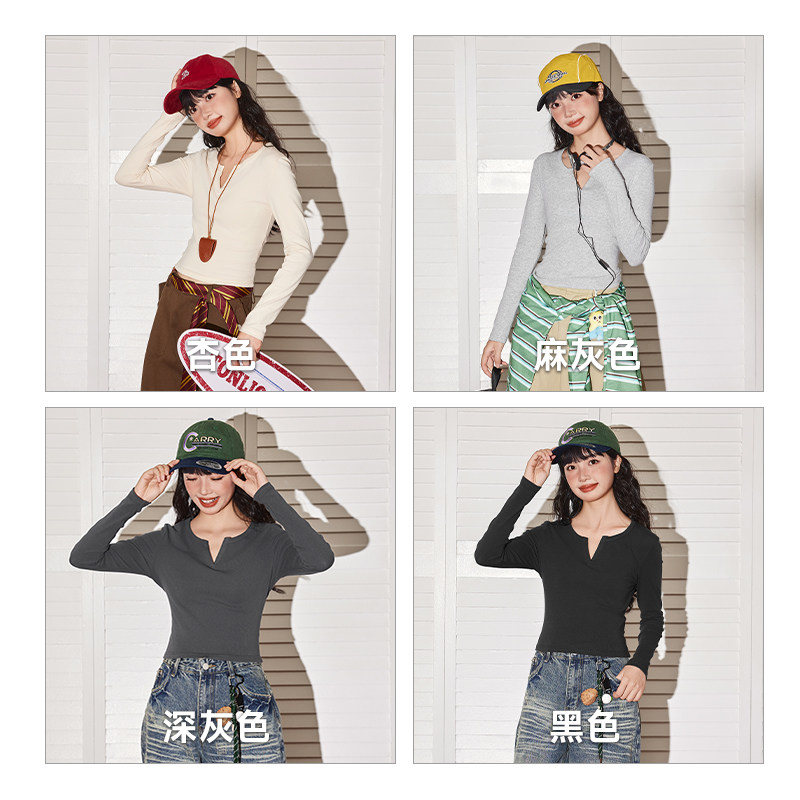 唐狮官方黑色v领长袖t恤女2026新款春秋小个子修身显瘦紧身上衣VB