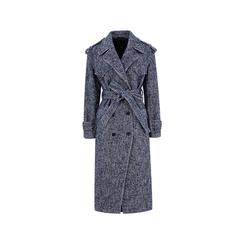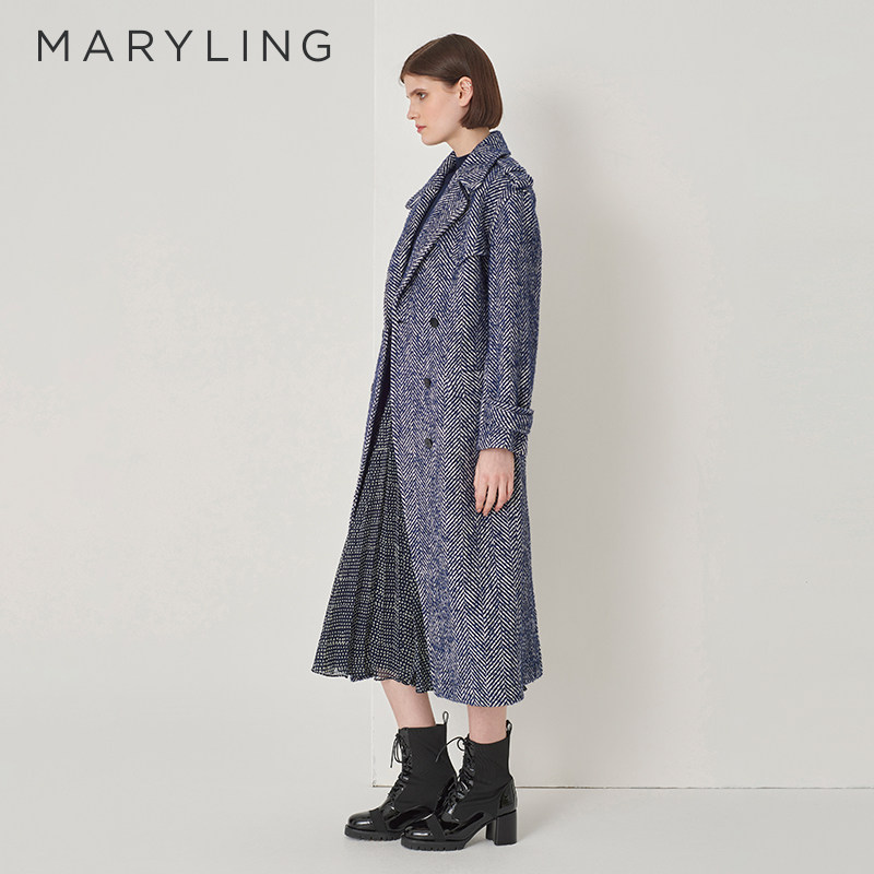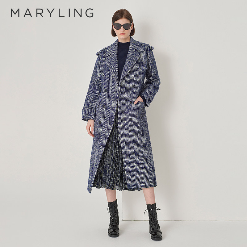 MARYLING玛俪琳冬季新品蓝白色人字纹翻领双排扣大衣高级感外套