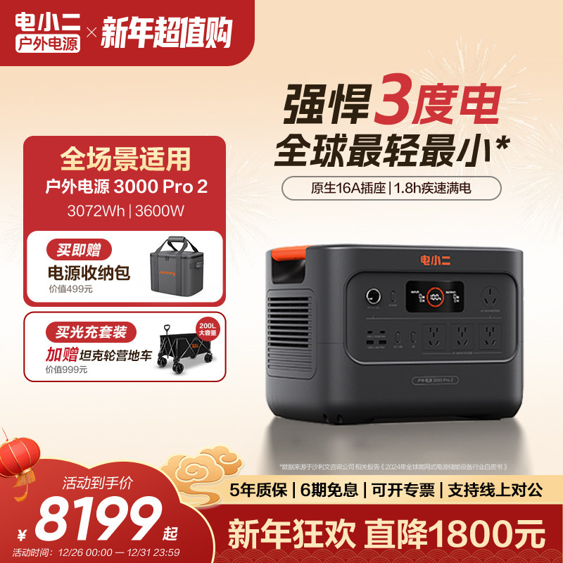 电小二【3度电新品】3600W快充户外电源220v移动大容量16A插座自驾游车载蓄电池备用电瓶摆摊专用磷酸铁锂