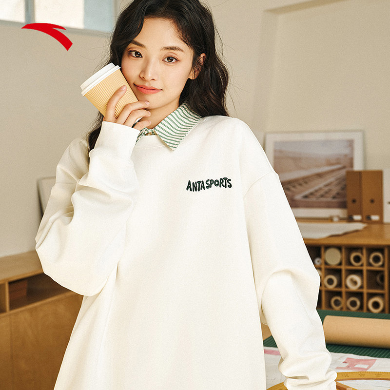 鸿星尔克加绒卫衣女款冬季新款女士运动加厚圆领长袖白色上衣女装