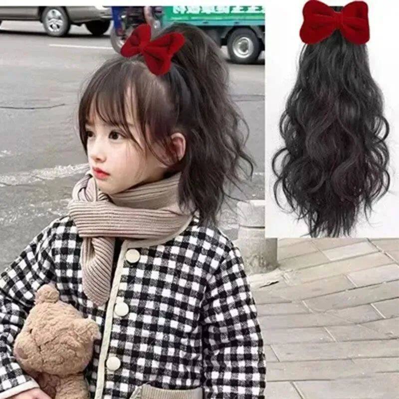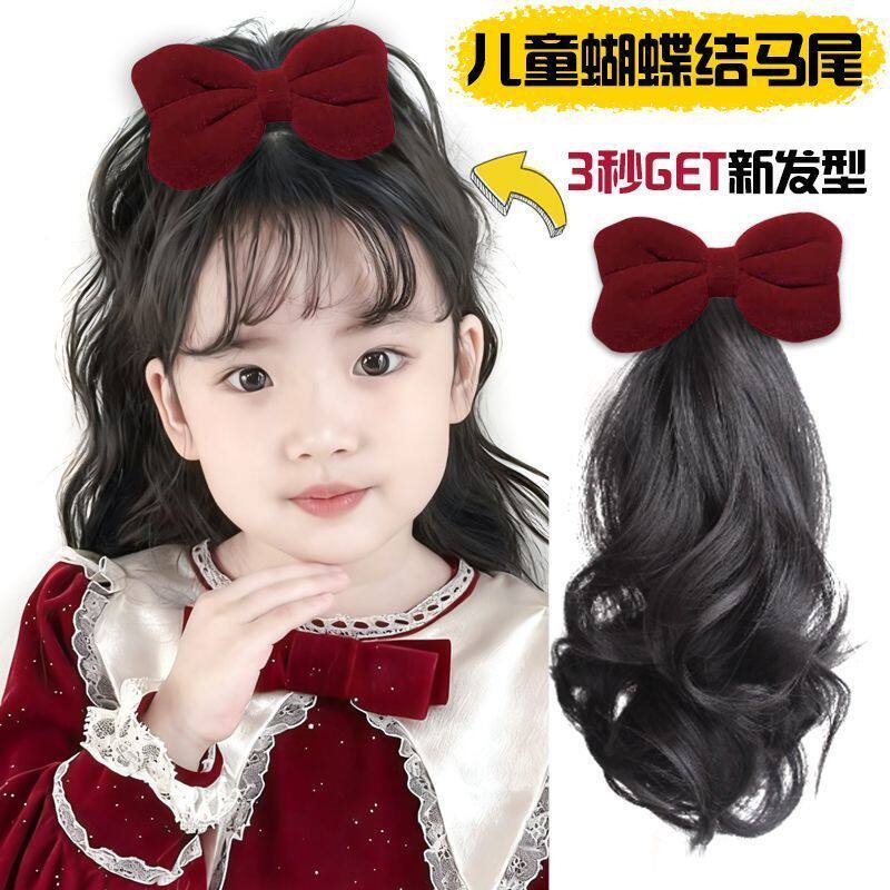 新春儿童假发丝绒蝴蝶结羊毛卷洋气可爱小公主卷发30厘米长发马尾