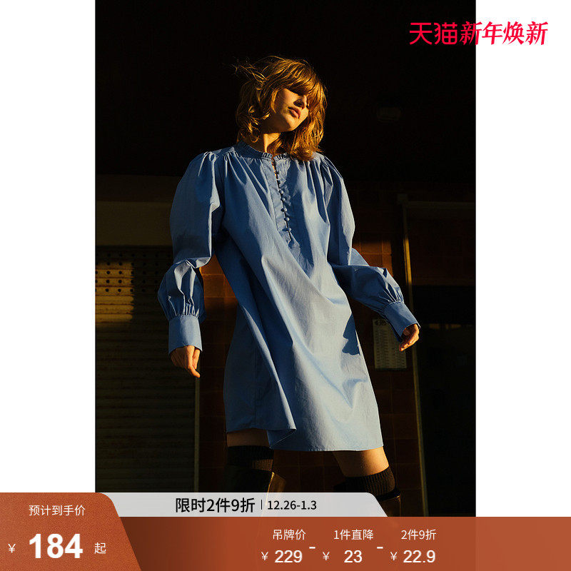 HM女装连衣裙冬季时尚休闲舒适法式气质灯笼袖纯棉A字裙1264747