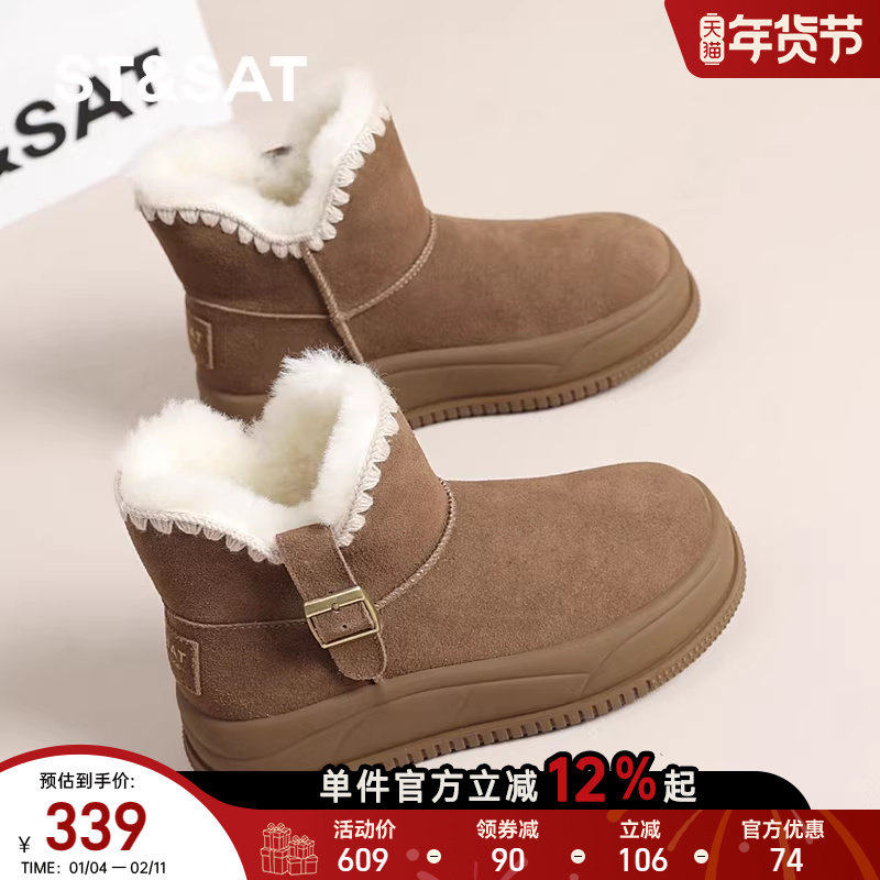 星期六靴子冬季新款复古雪地靴女款真皮保暖短筒靴厚底防滑大棉靴