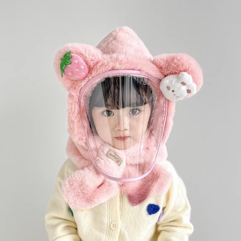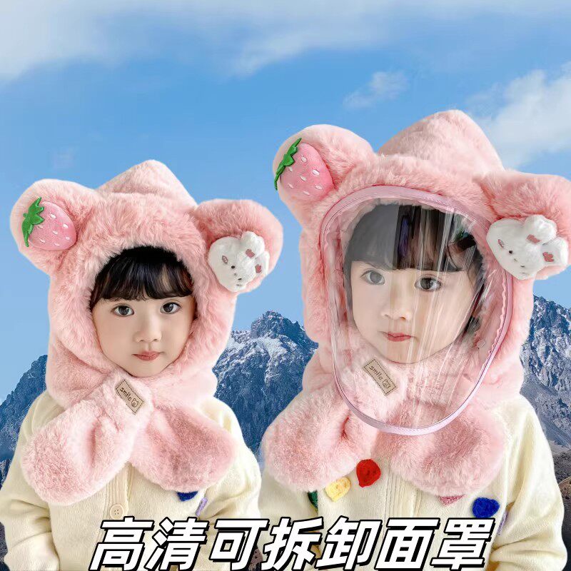 宝宝帽子冬骑行保暖毛绒帽男女童防护面罩儿童围巾手套一体帽防风