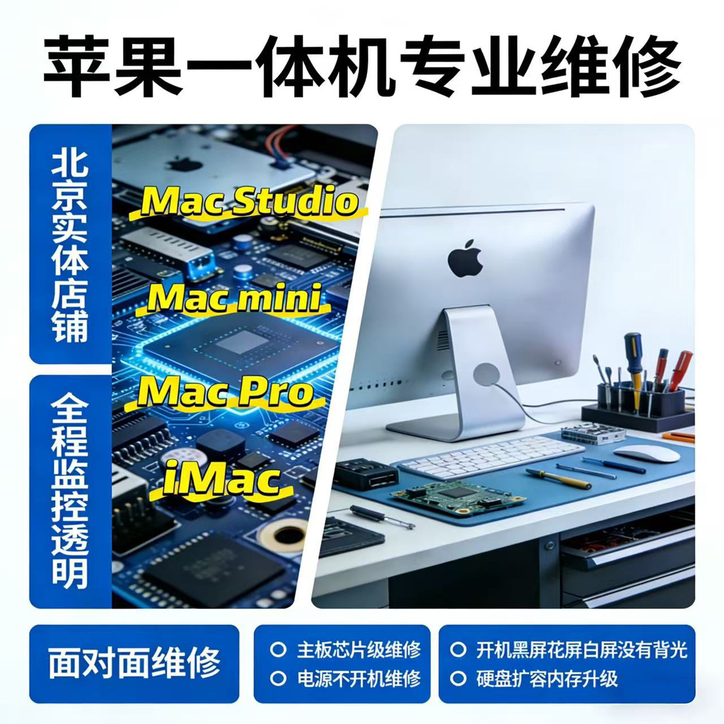 苹果iMac21寸27寸一体机主板电源不开机维修花屏硬盘扩容内存升级