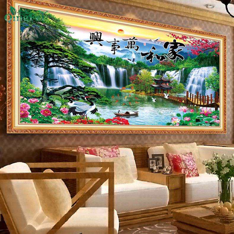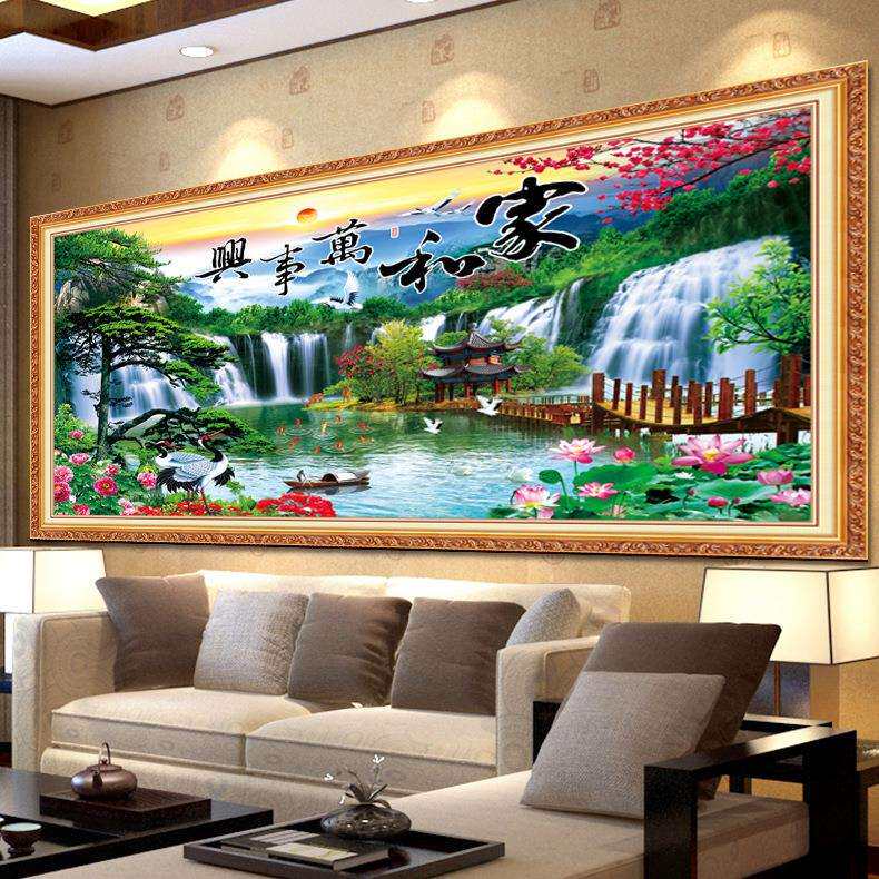 青飞精准印布家和万事兴迎客松流水生财十字绣仙鹤客厅大气挂画绣