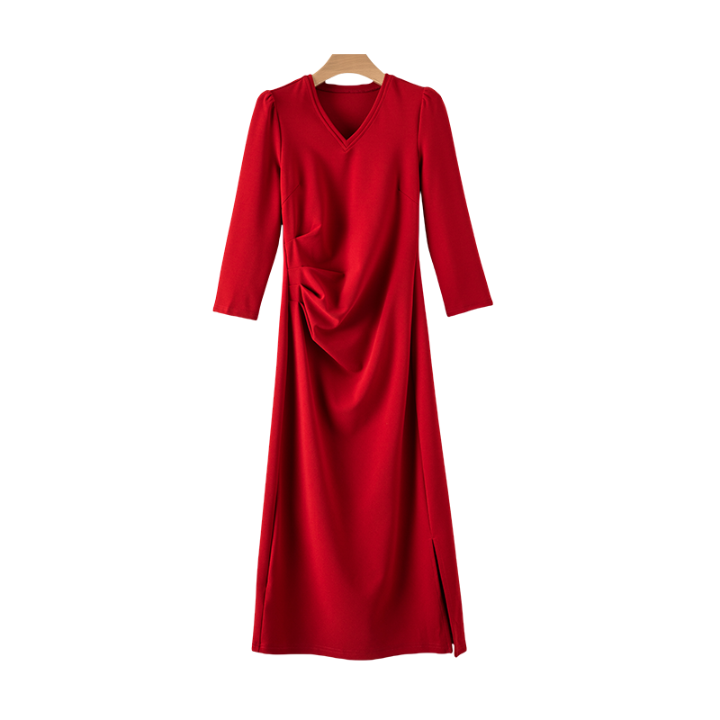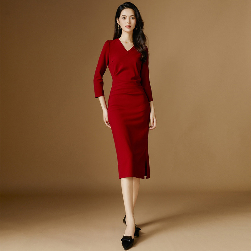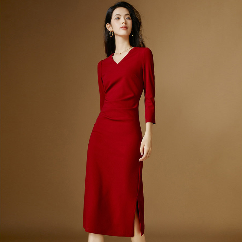 晚白2026年春新款时尚中国红V领裙子气质简约修身显瘦连衣裙