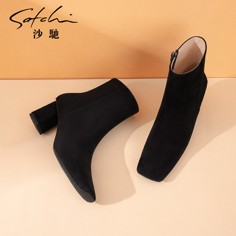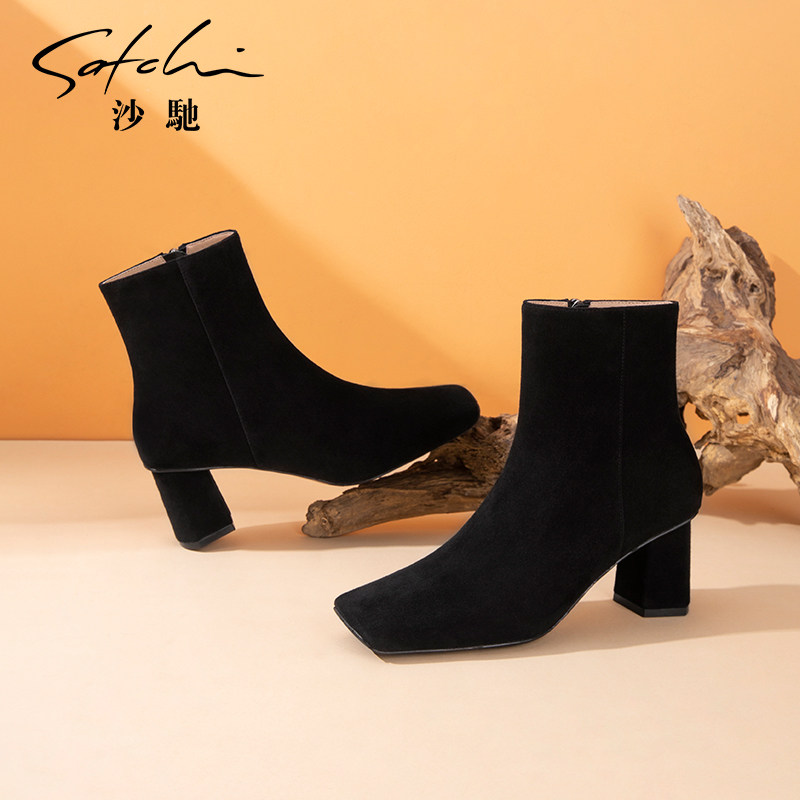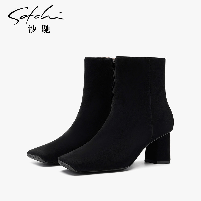 沙驰女鞋粗跟高跟短靴女冬季新款羊反绒瘦瘦时装靴方头时尚妈妈靴