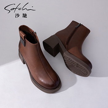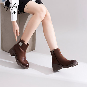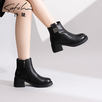 沙驰女鞋秋冬新款粗跟中跟短靴加绒保暖时装靴真皮通勤妈妈裸靴