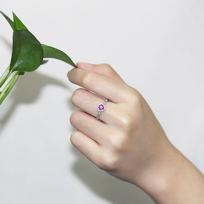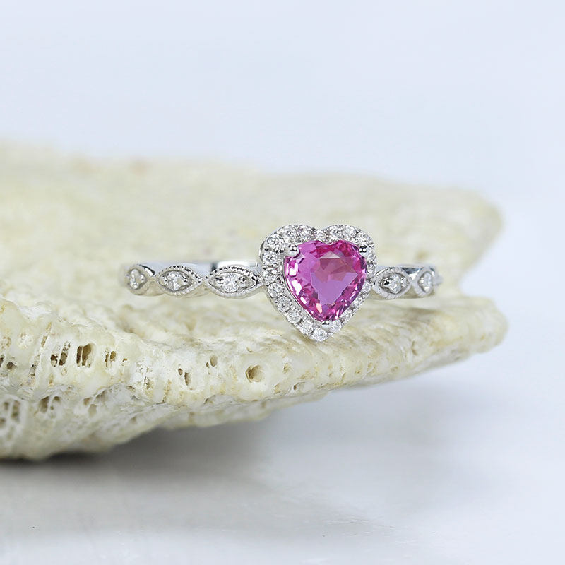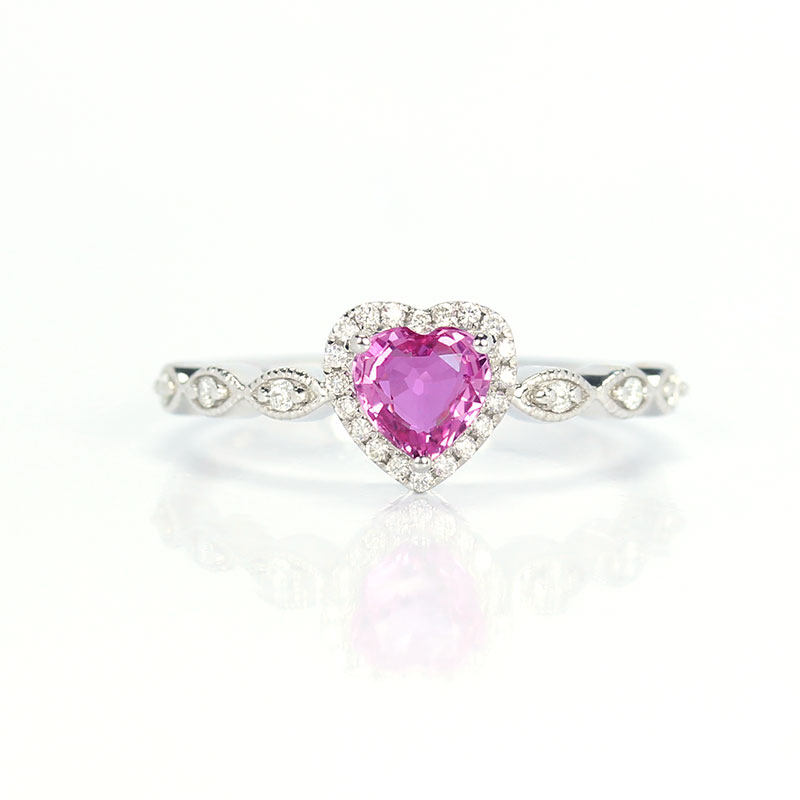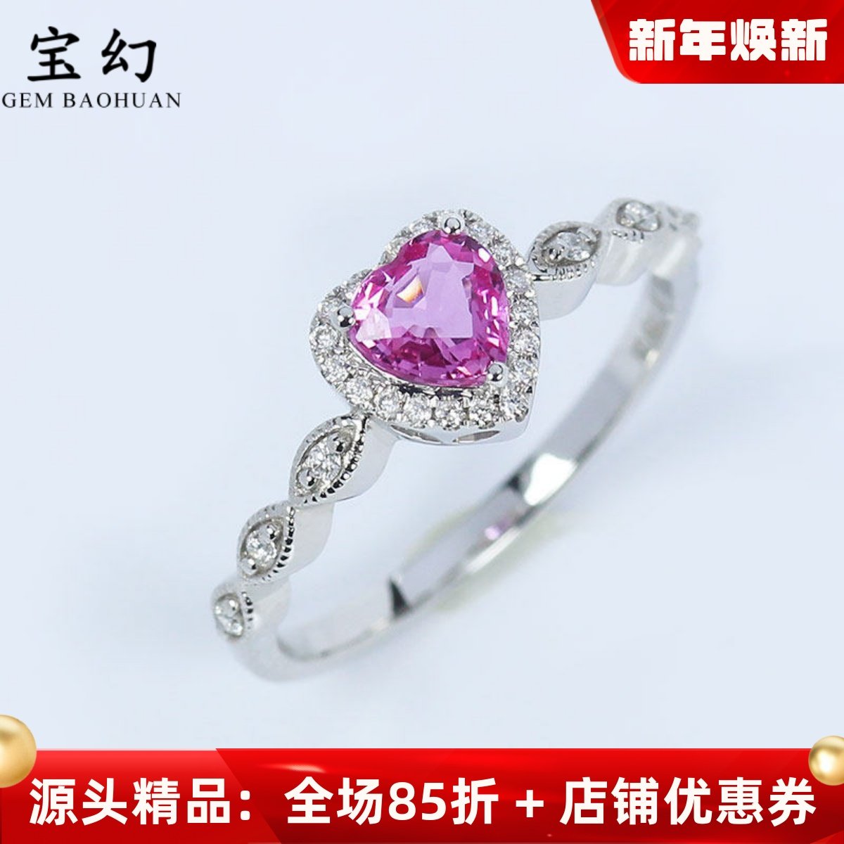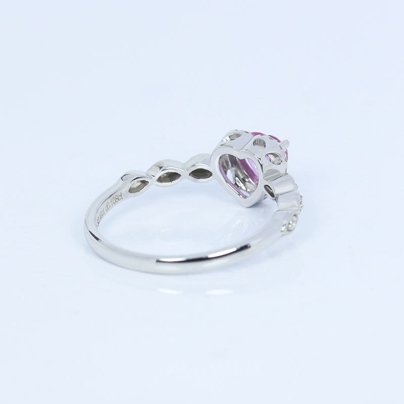 18K白金天然樱花粉色心形蓝宝石戒指 紫色镶嵌钻石求婚戒复古女款