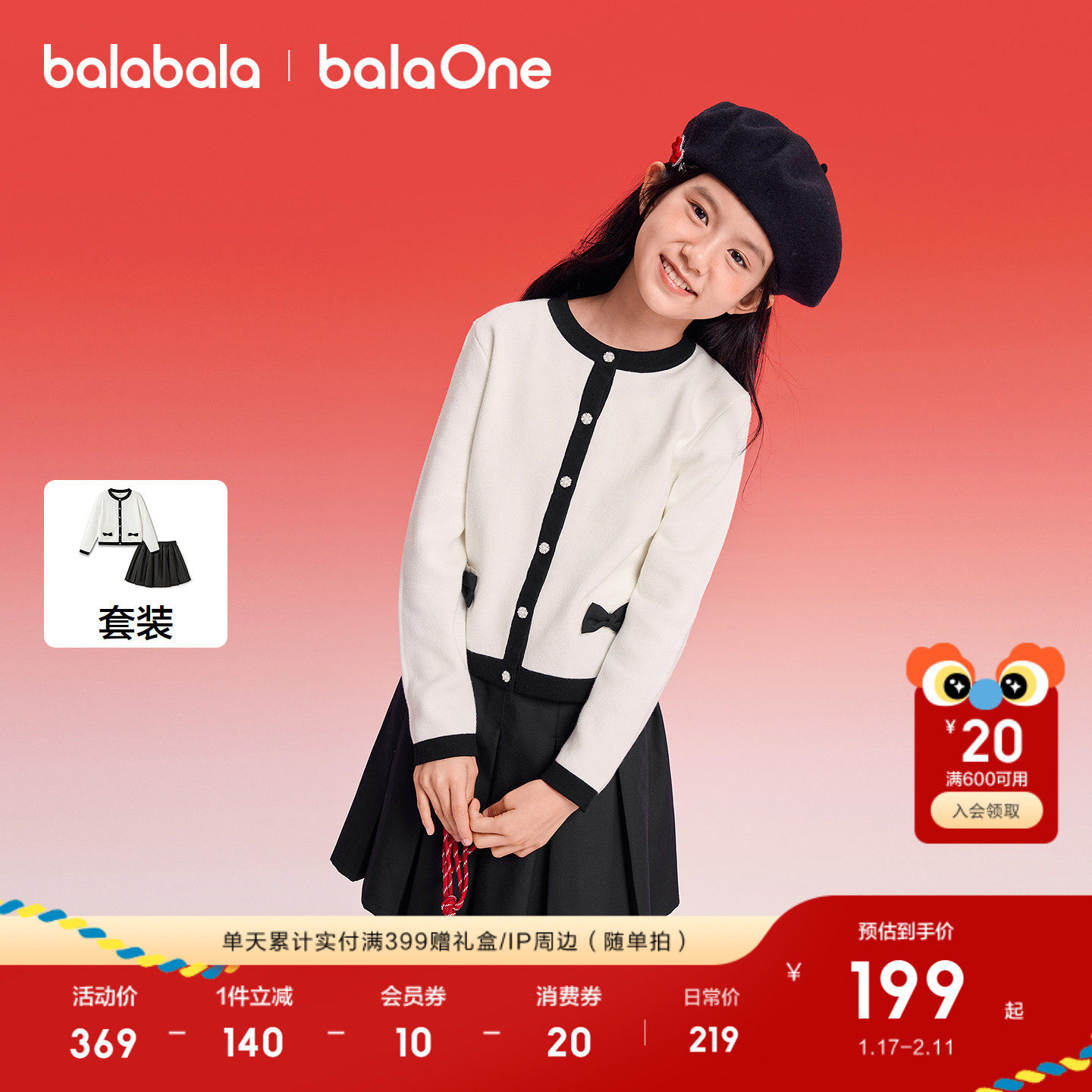 巴拉巴拉童装儿童套装女童拜年服2026新款冬装小香风两件套红色潮