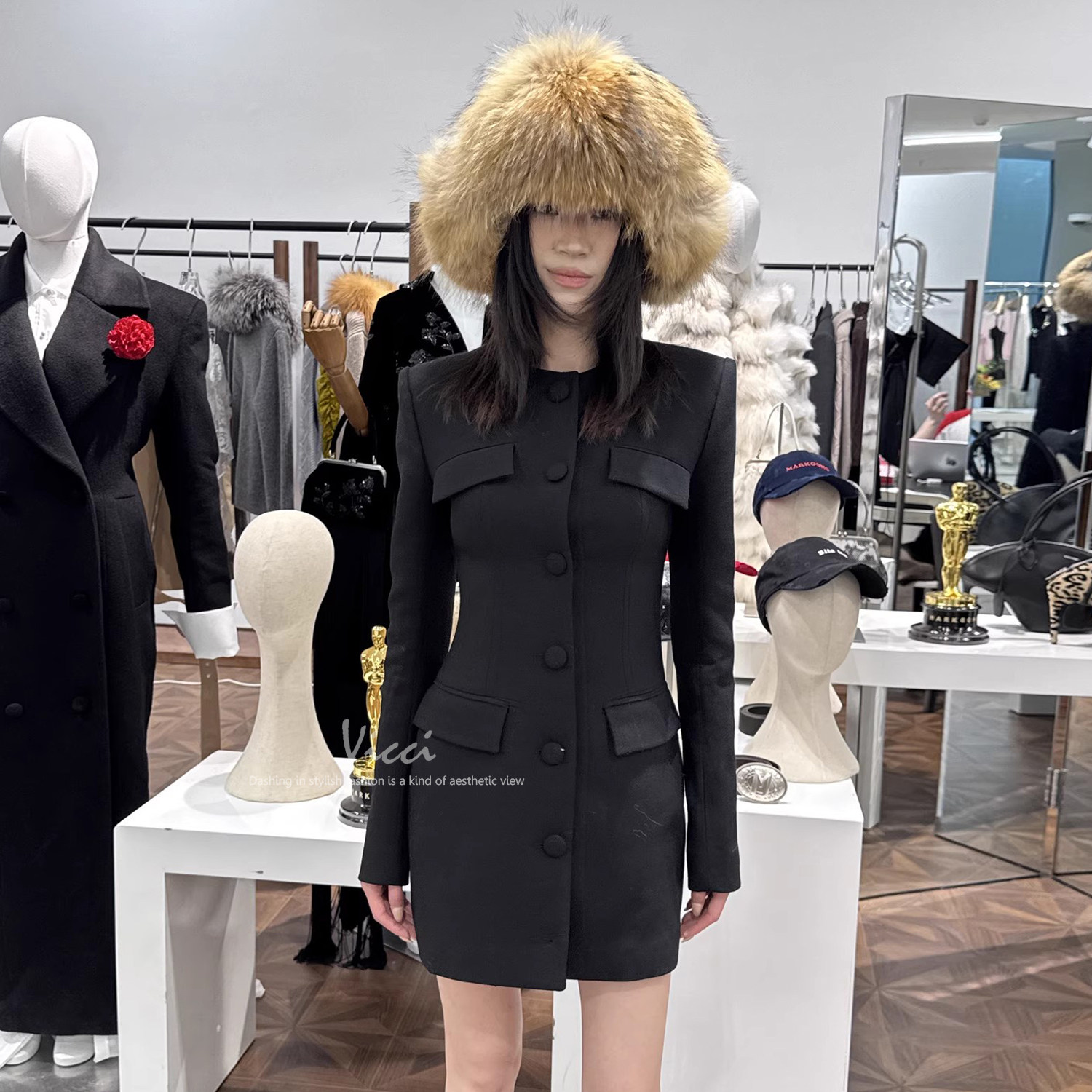 法式复古小香风无领连衣裙高级百搭单排扣修身收腰圆领垫肩西装裙