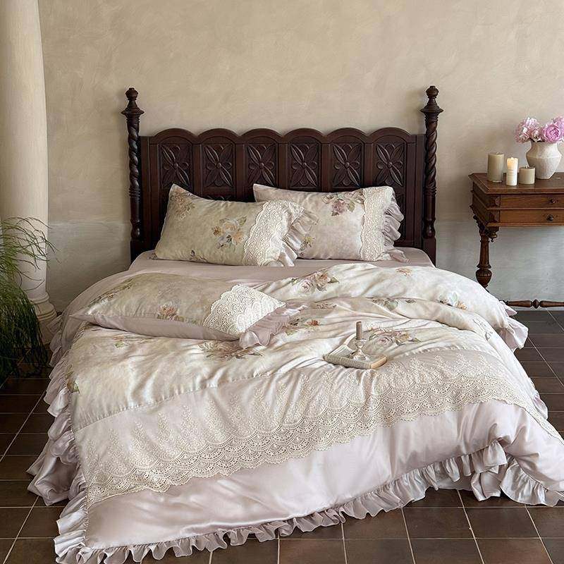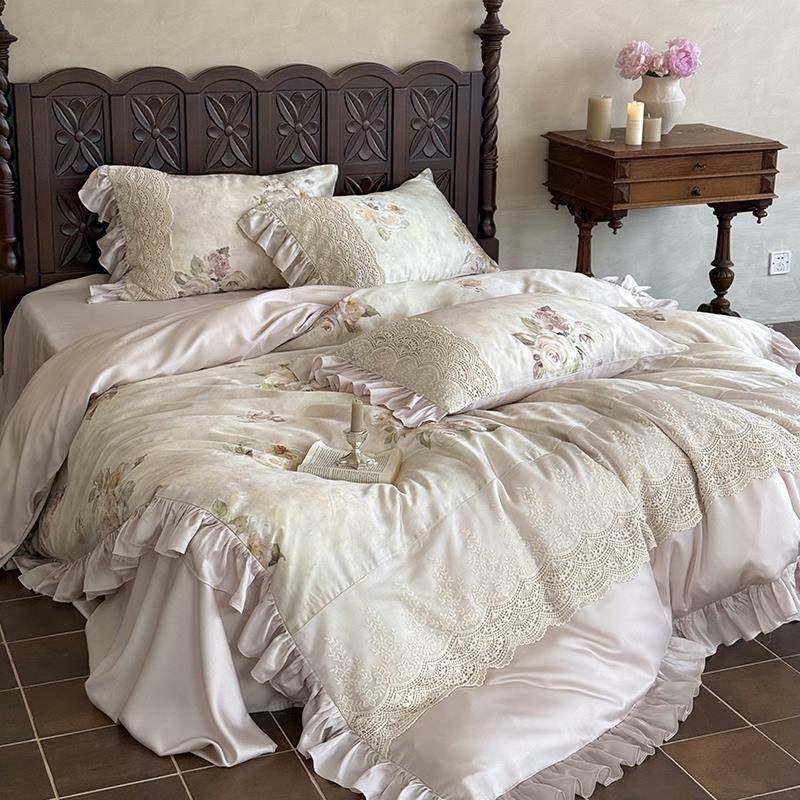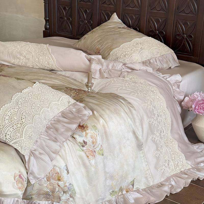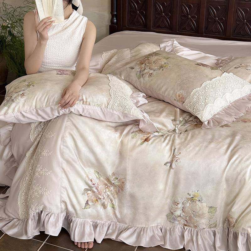 法式公主风凉感莱赛尔天丝四件套花卉印花夏季裸睡蕾丝边被套床品