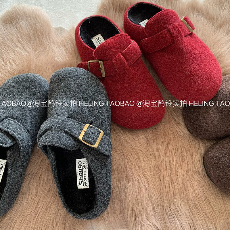灰色毛毡勃肯鞋半拖女2025新款秋冬加绒一脚蹬懒人外穿包头棉拖鞋