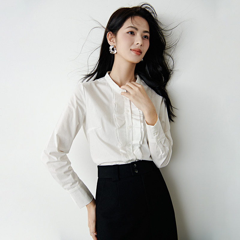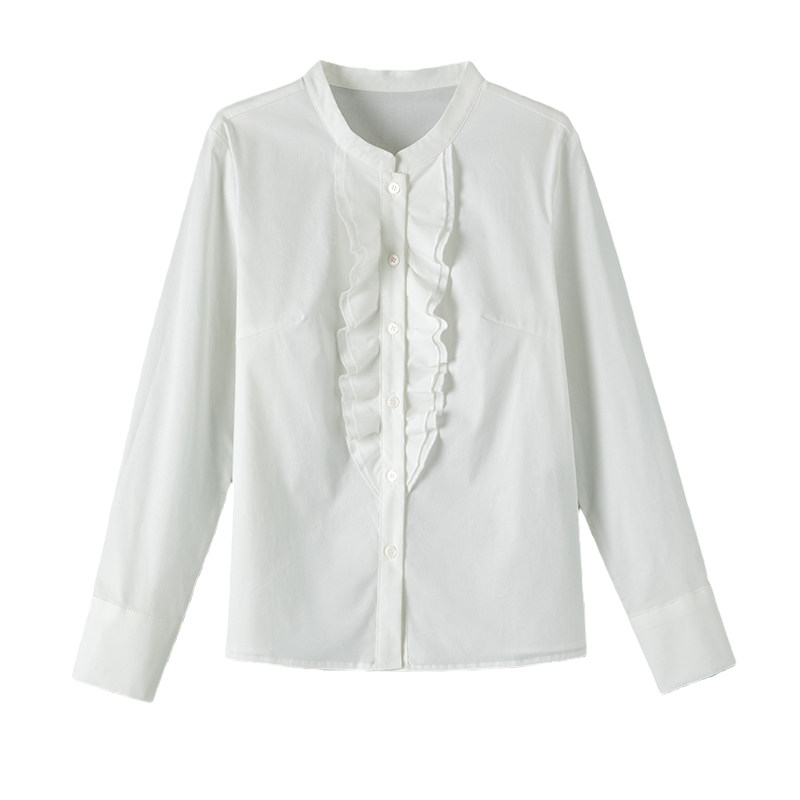 晚白2026年春新款时尚法式荷叶边立领棉衬衣气质职场通勤衬衫女
