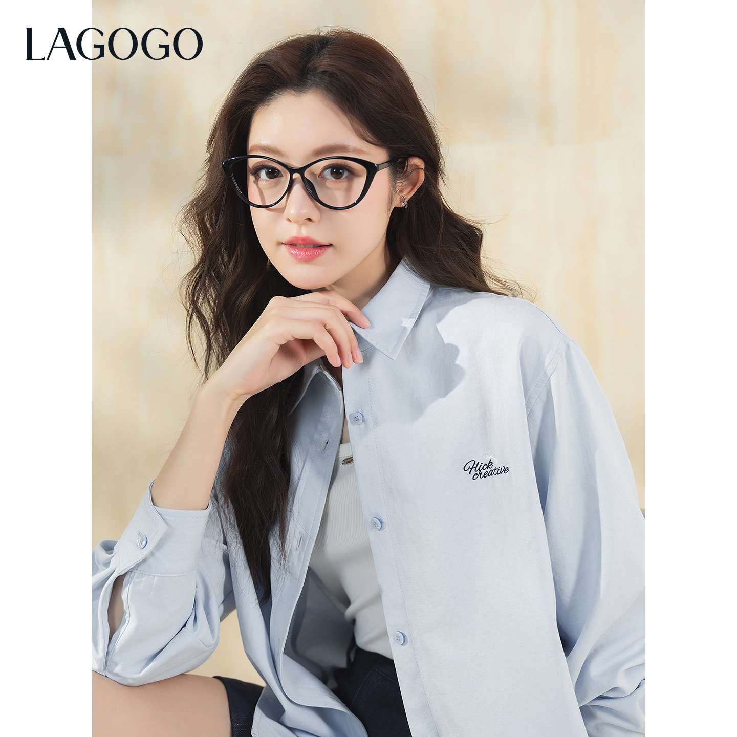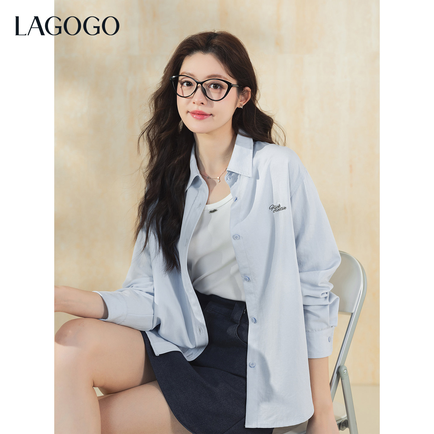 LAGOGO软绣轻漾刺绣蓝色衬衫女拉谷谷2026春季新款泡泡感长袖上衣