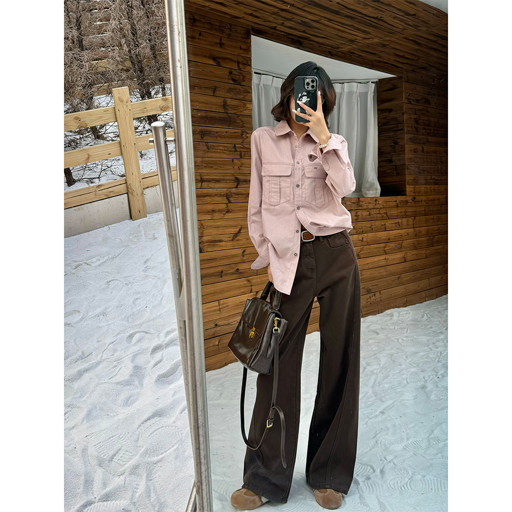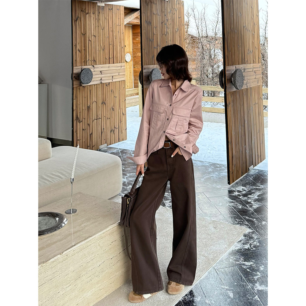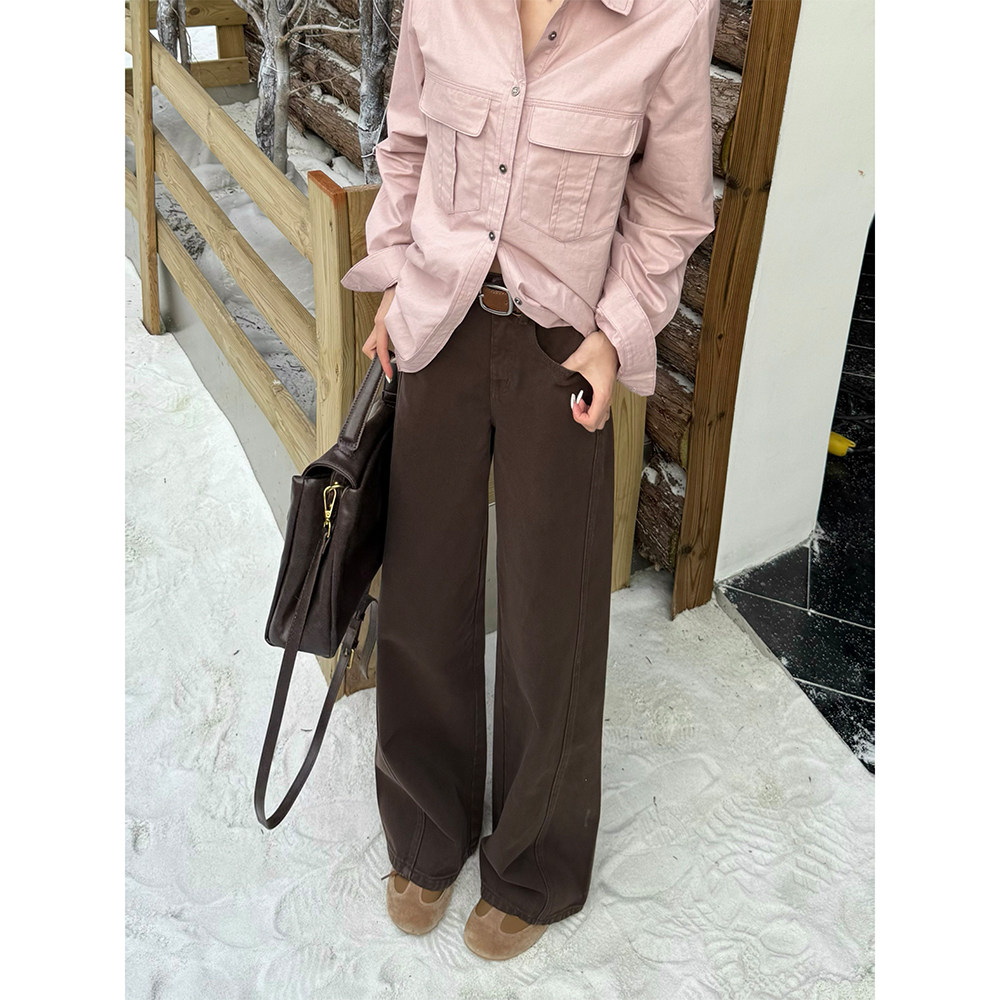 王家有鱼咖色水洗阔腿牛仔裤女2025秋新款宽松百搭窄版垂感拖地裤
