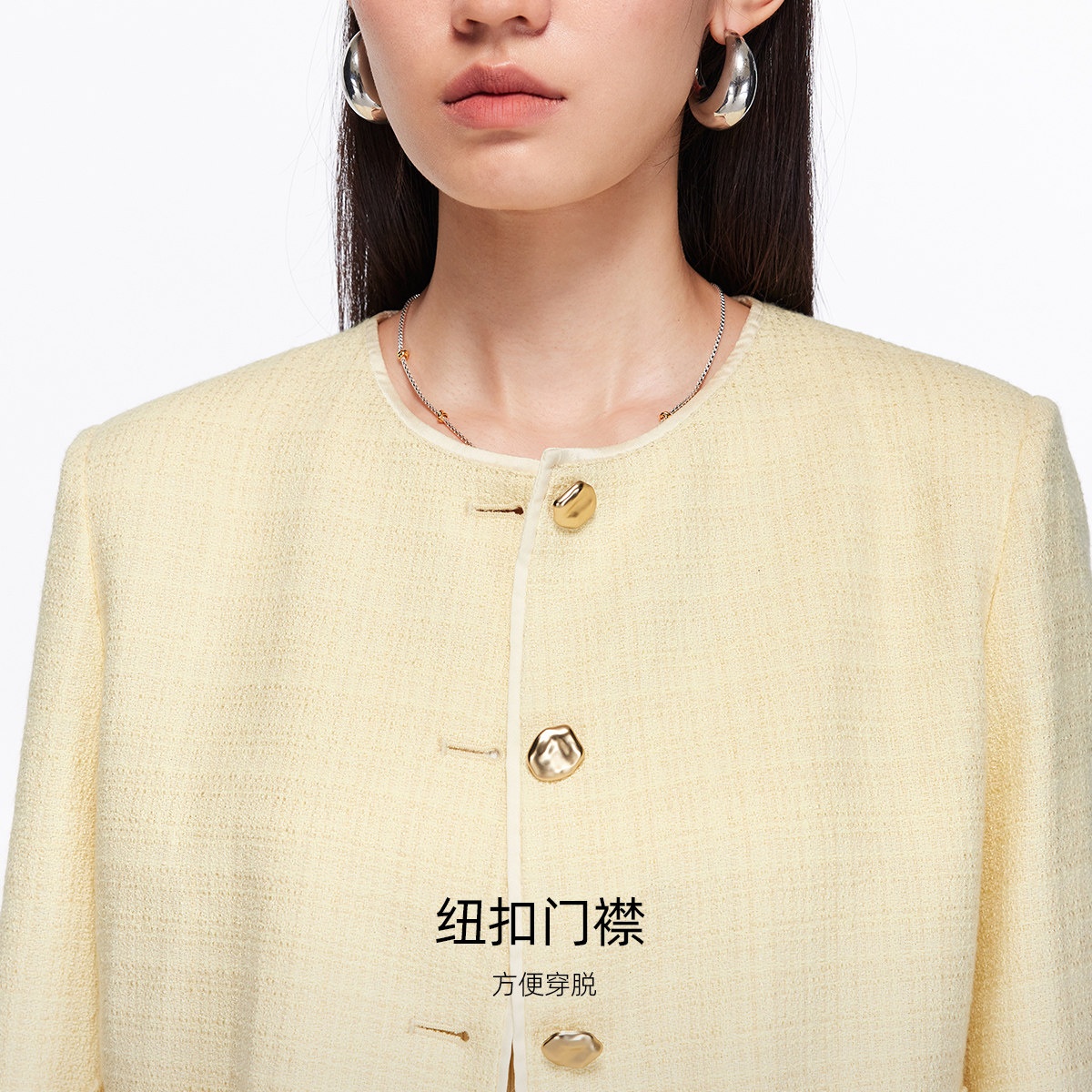 圆领领型 修饰颈部线条;纽扣门襟 方便穿脱