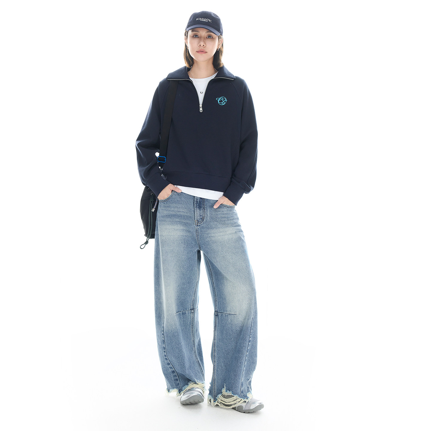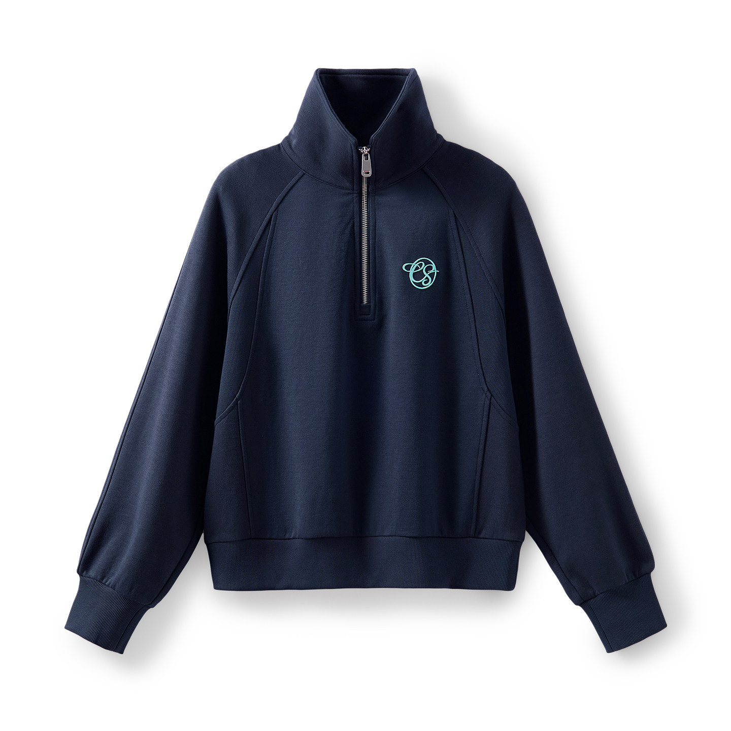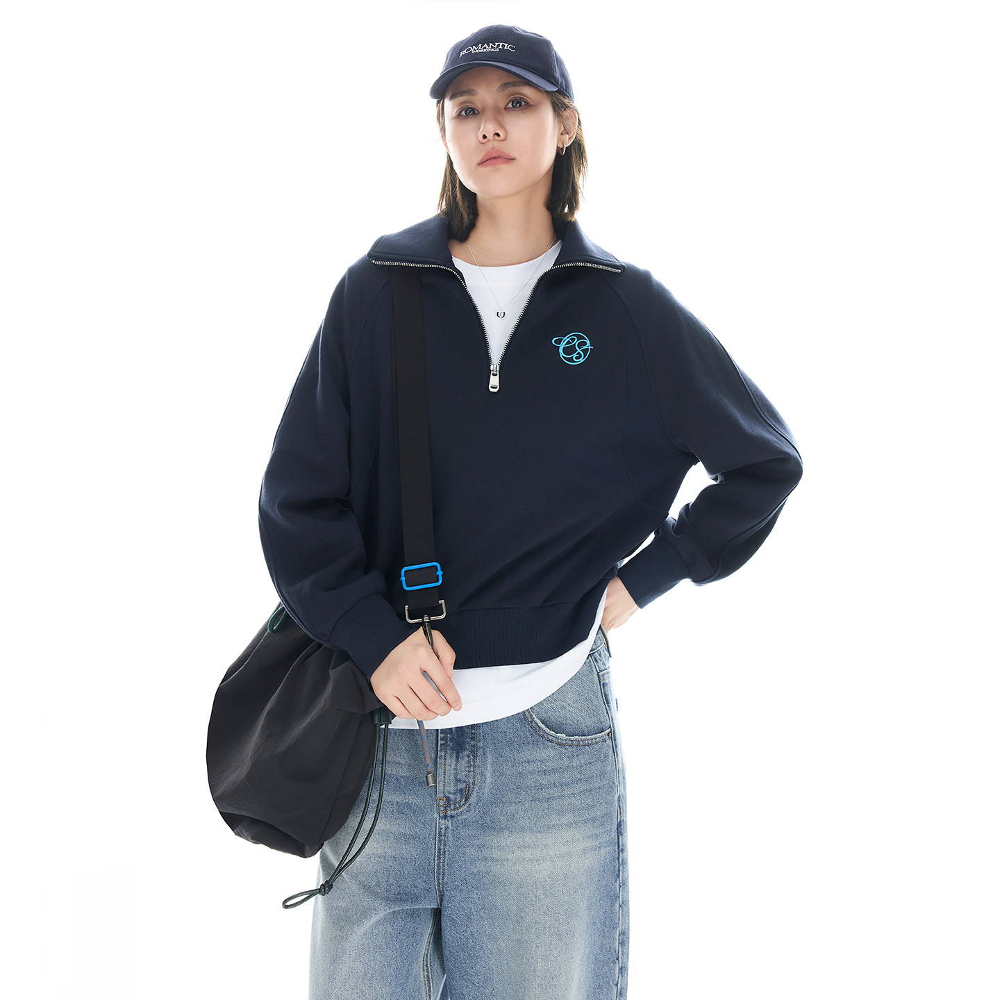 云上生活【周末】复古半拉链翻领插肩袖卫衣宽松显瘦藏青上衣女