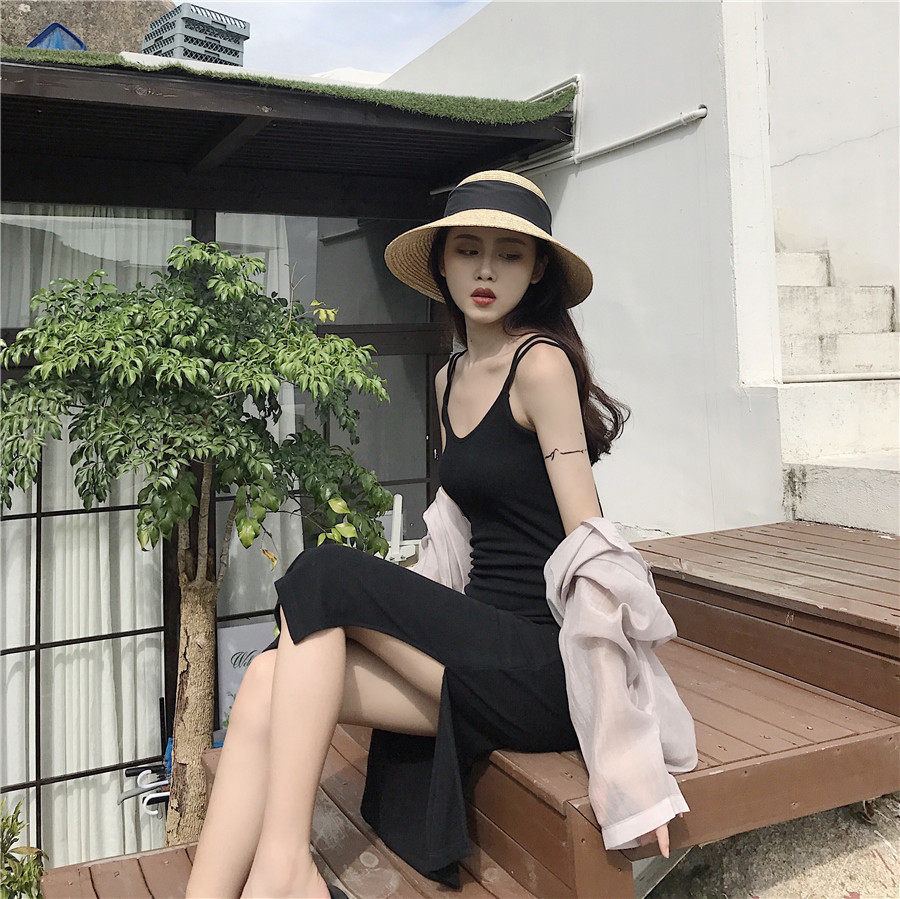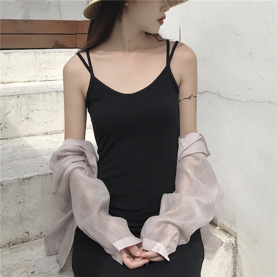 半练带胸垫裙子吊带裙白色连衣裙秋季流行长裙小个子黑色背心裙女