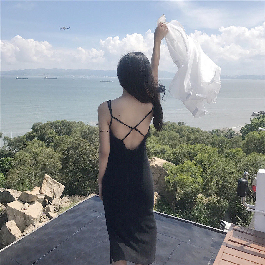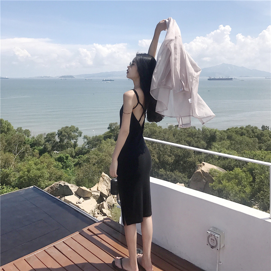 性感显瘦露背连衣裙夏季百搭交叉带吊带包臀裙中长款侧开叉连衣裙
